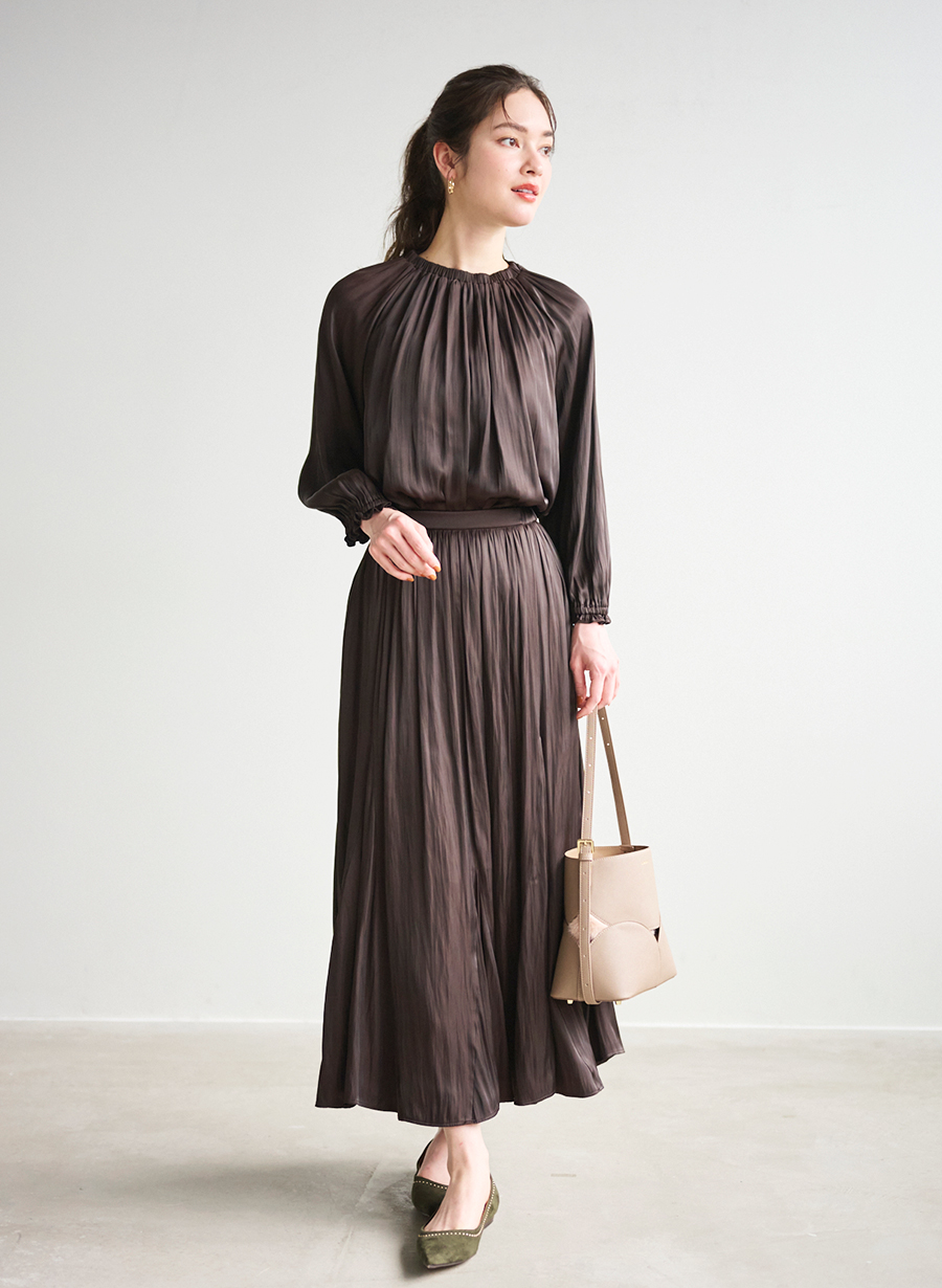 STYLING NO.2891 2025.9.18 モデル:eriko モデル身長:158cm 2人がお気に入り登録しています 着用アイテム 【新色追加】レーヨンシルクVネックニットプルオーバー SIZE:38 COLOR:ブラウン ¥17,600 割繊ギャザースカート /セットアップ可 SIZE:38 COLOR:ブラウン ¥22,000 ニードルパンチデニムジャケット/セットアップ可 SIZE:38 COLOR:ブラウン ¥28,600 パール×ダイヤレーンネックレス SIZE:FREE COLOR:キスカ×クリスタル ¥8,580 スリットデザインショートブーツ SIZE:38 COLOR:グレージュ ¥39,600 ※上記アイテム以外は、ONLINE SHOPでのお取り扱いはございません。