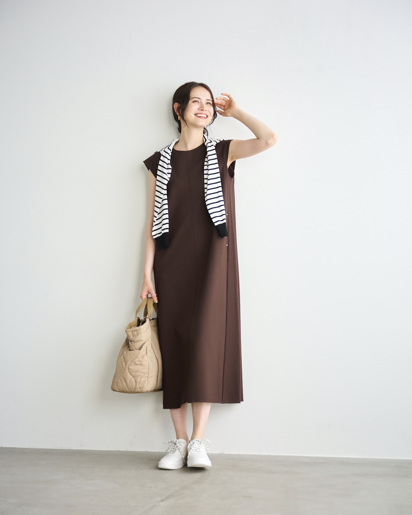 新幹線や車での長距離移動では、伸縮性があり快適に過ごせるカットソー素材のワンピースを。