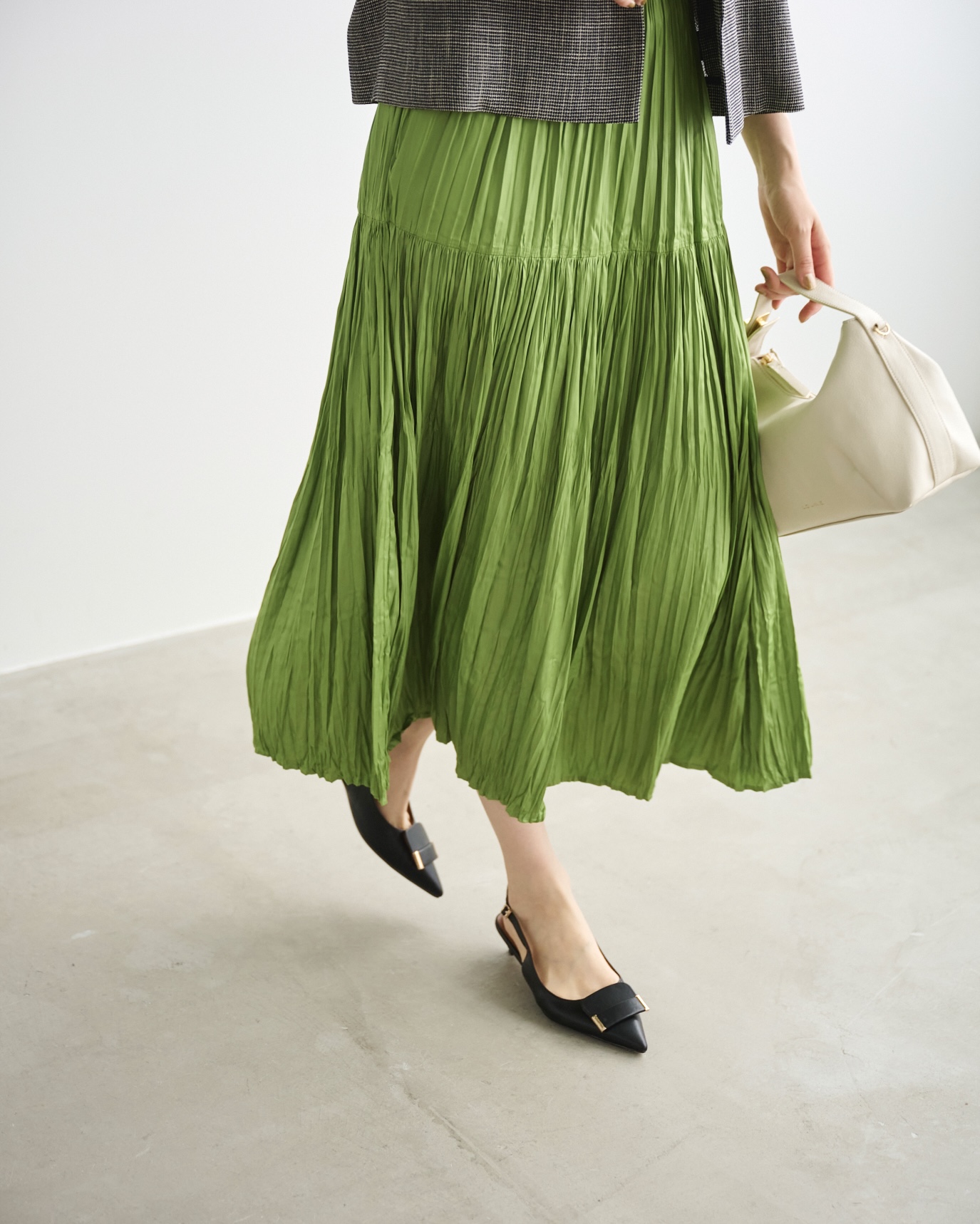 明るいグリーンのスカートが映えるコーデに。