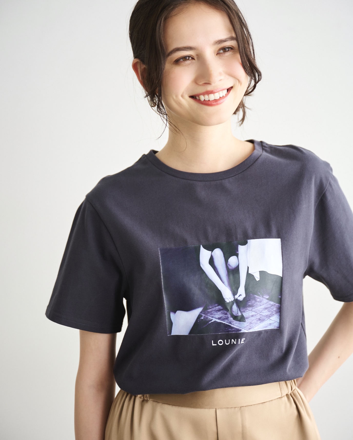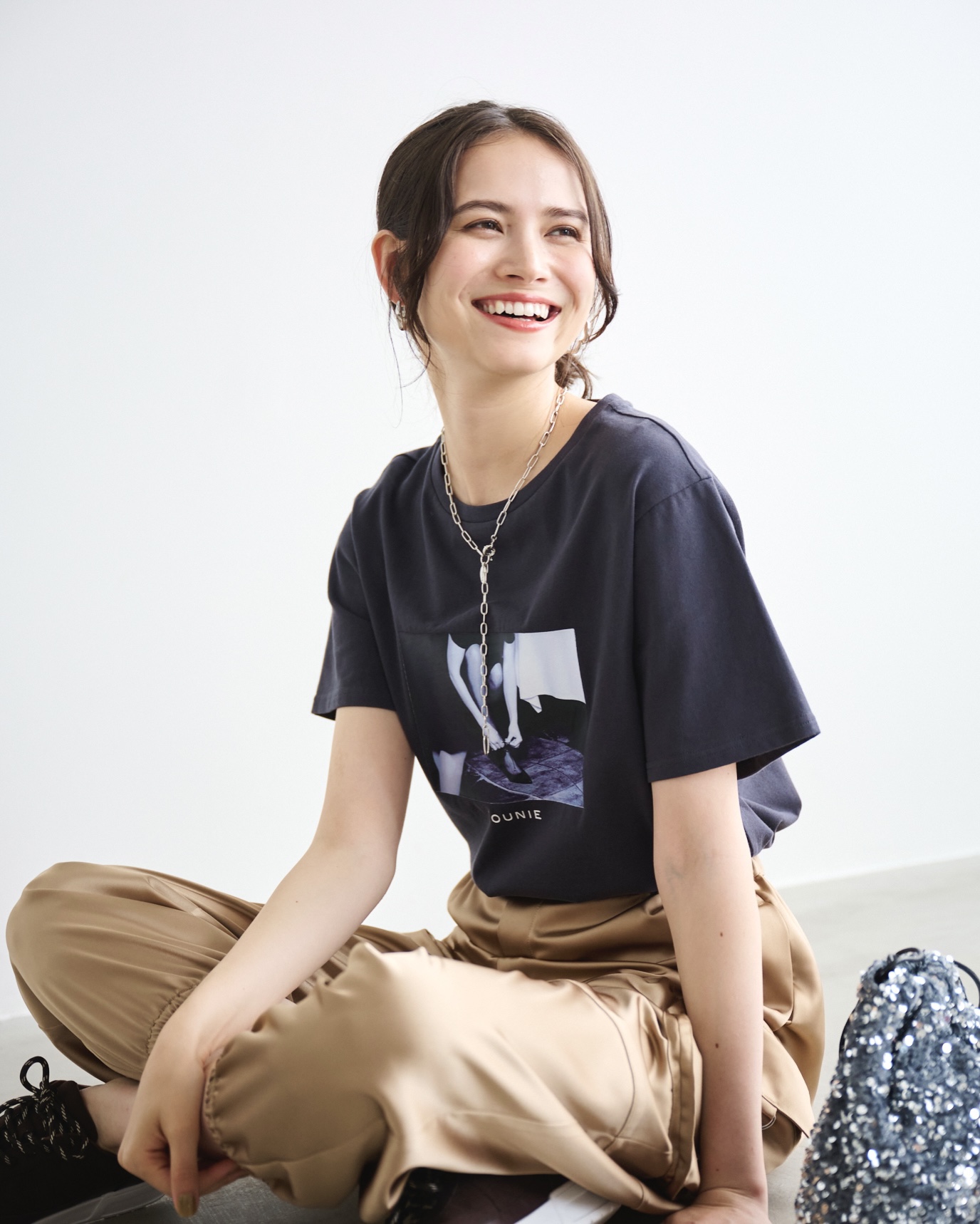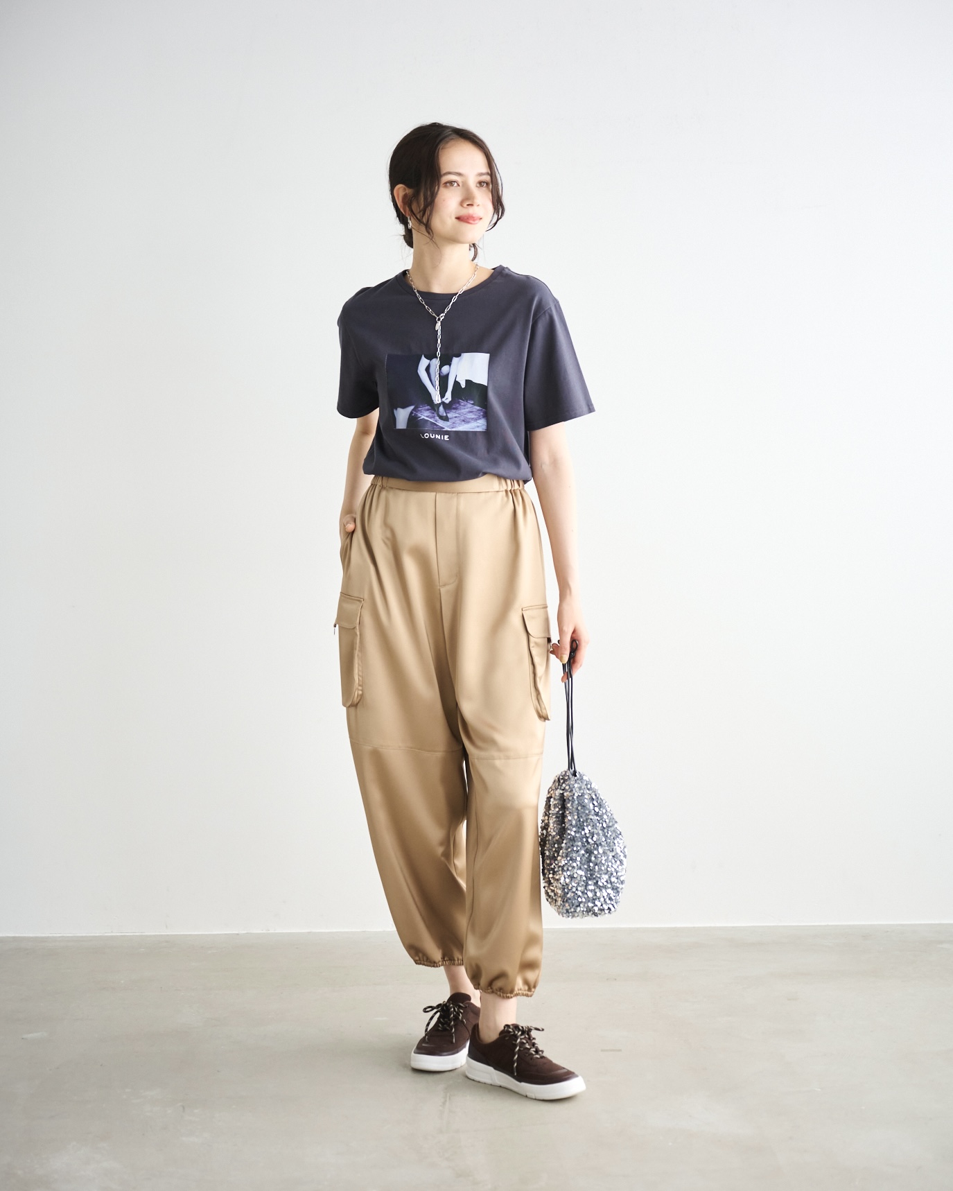 フォトTシャツ×カーゴパンツで動きやすさを重視したコーデ。上品な艶感素材で女性らしさを演出。