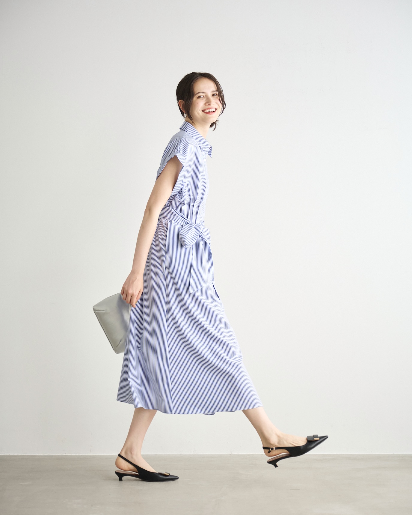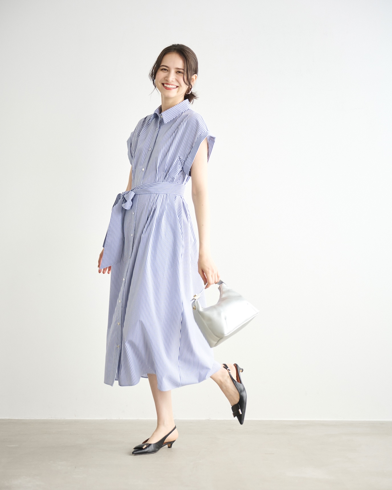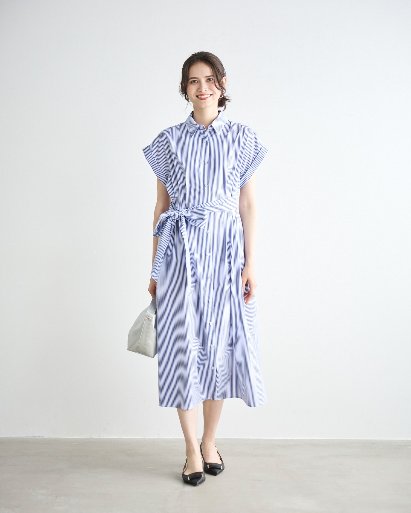 一枚で爽やかに決まるストライプシャツワンピース。