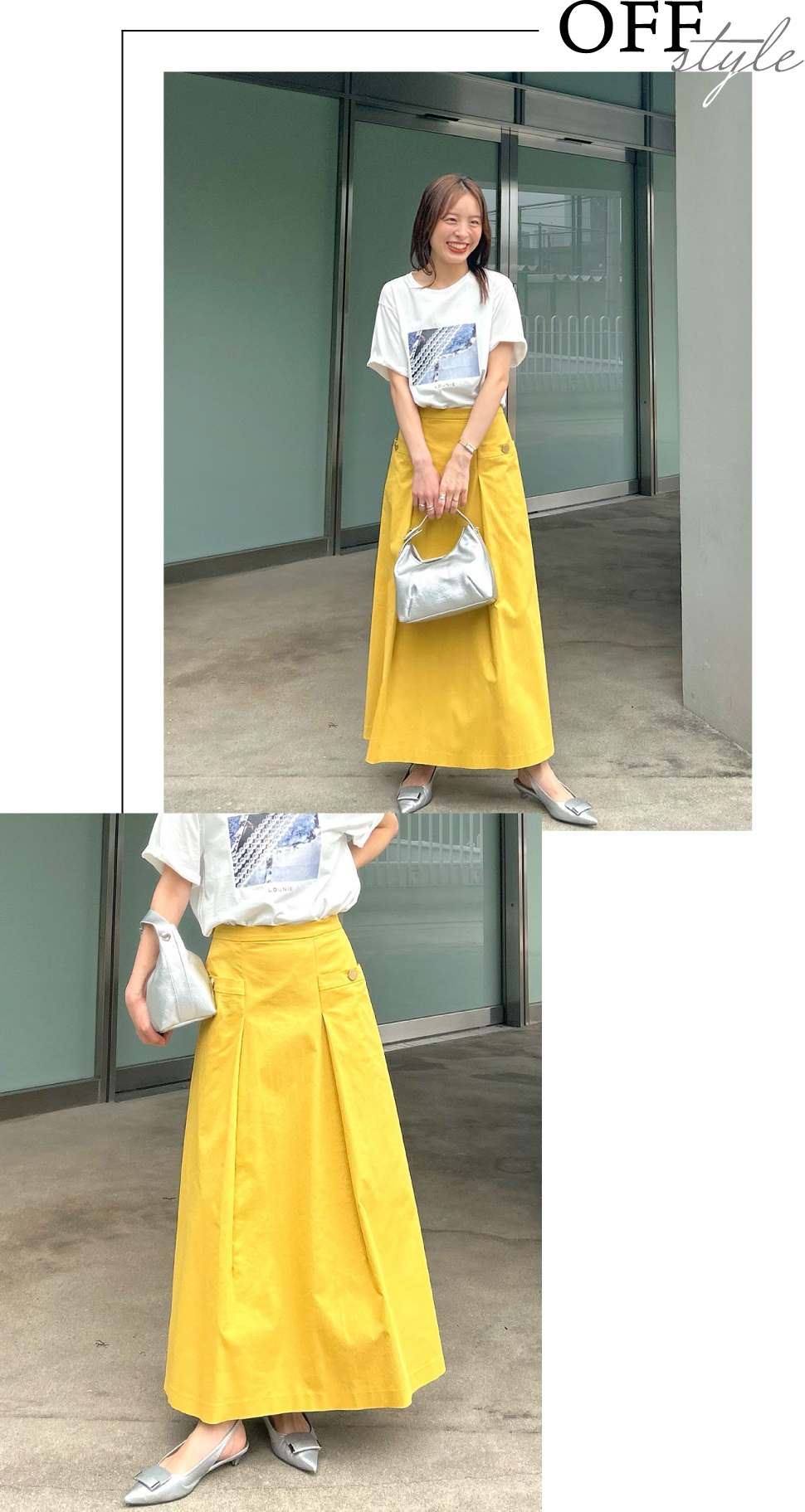マスタードカラーのスカートを引き立てるダークトンでまとめて。