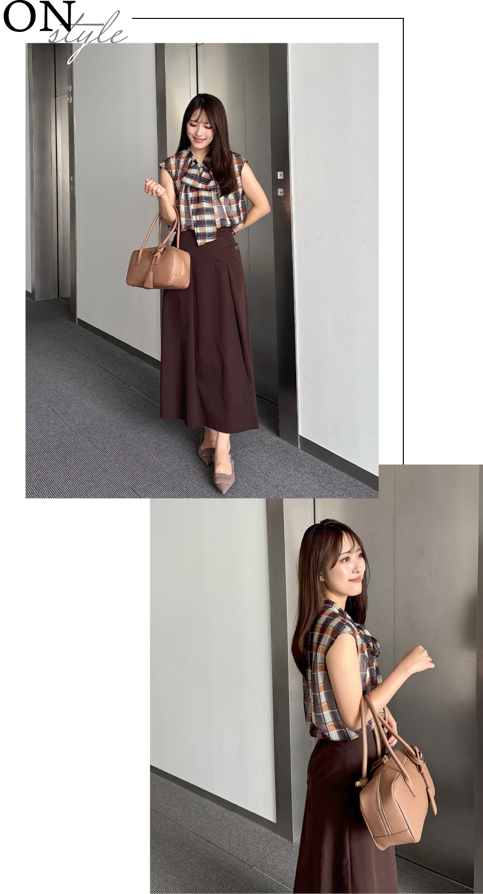スカートに合わせたブラウンカラーのチェック柄ブラウスで、秋を先取り。