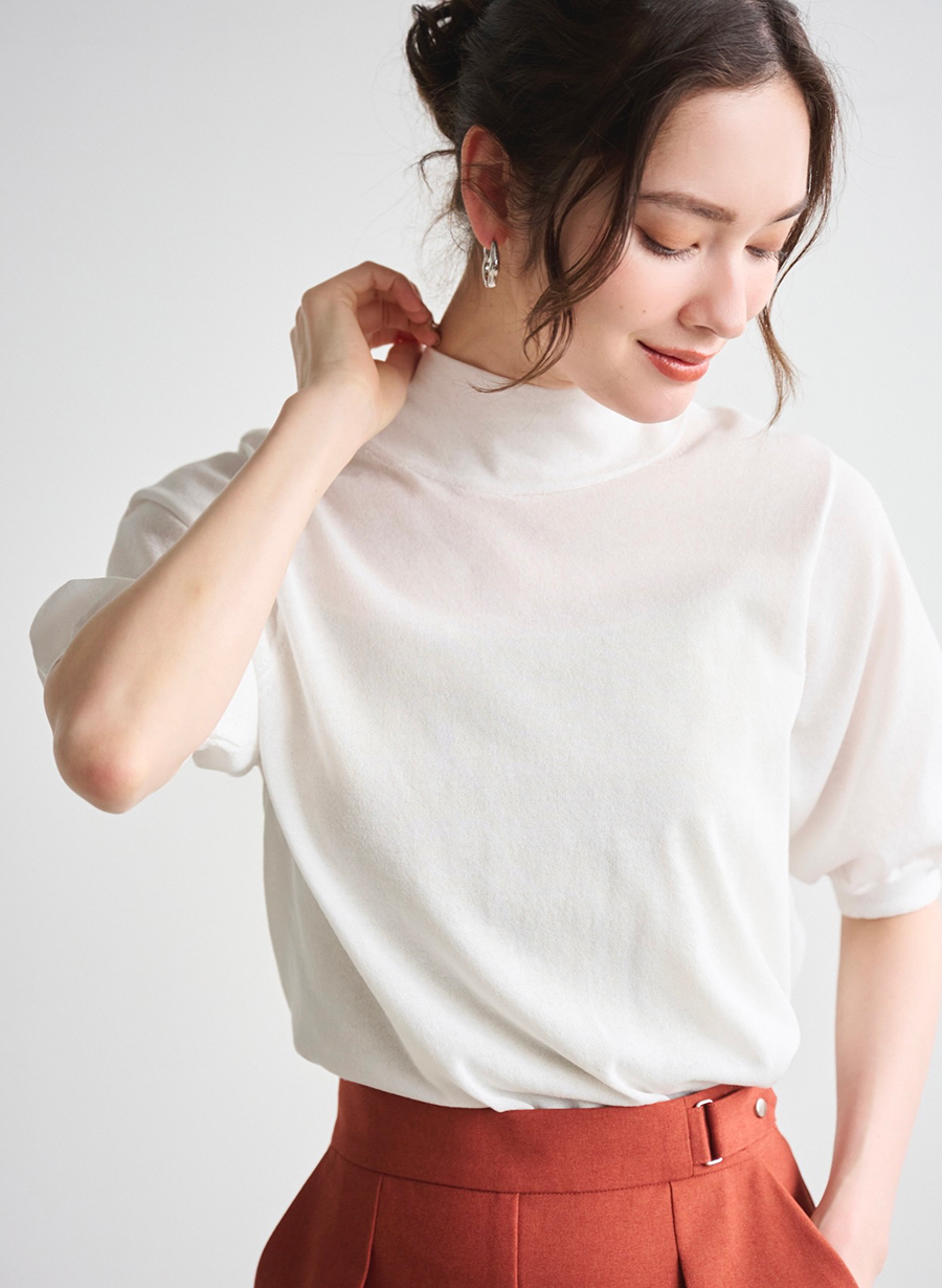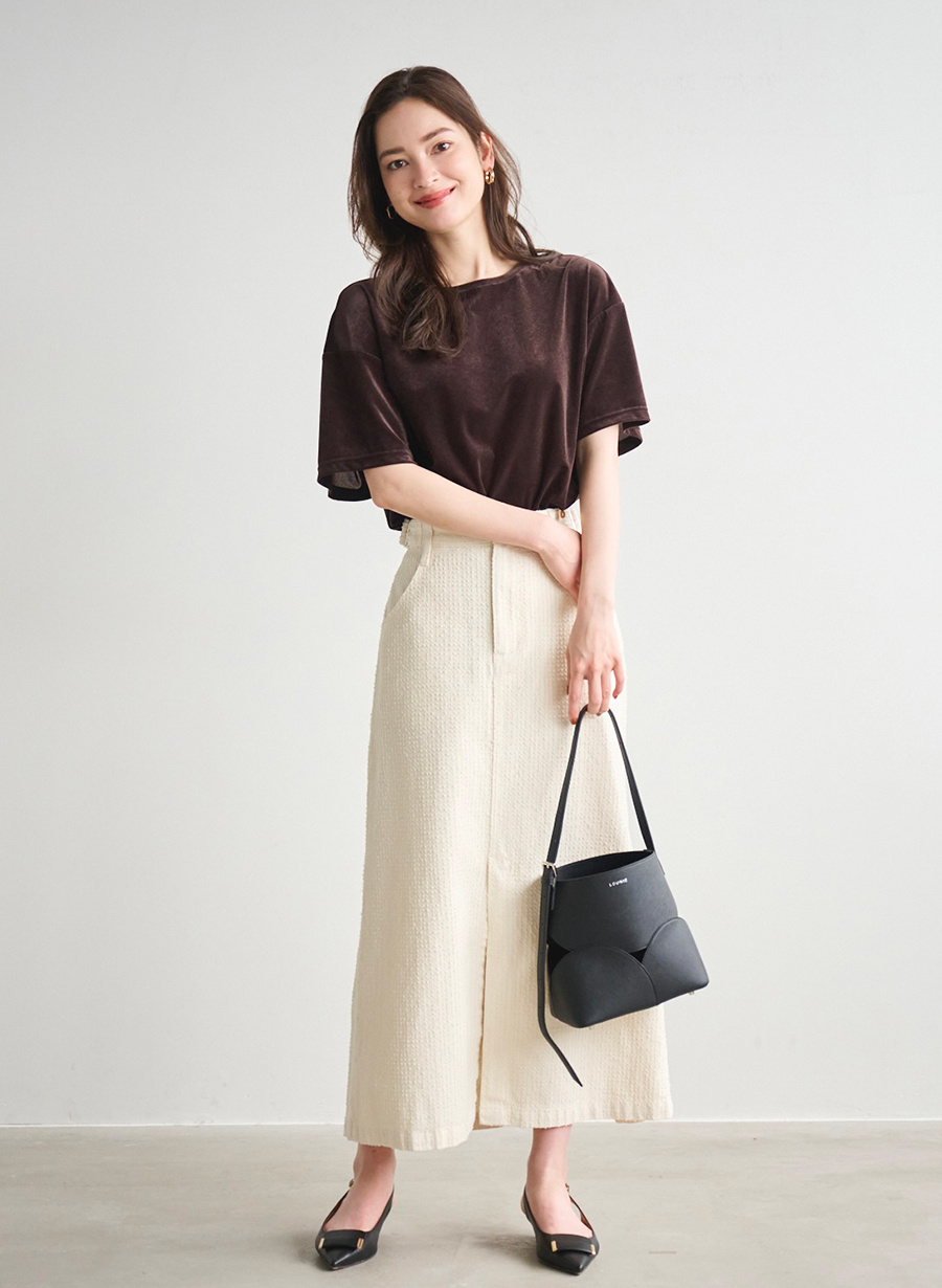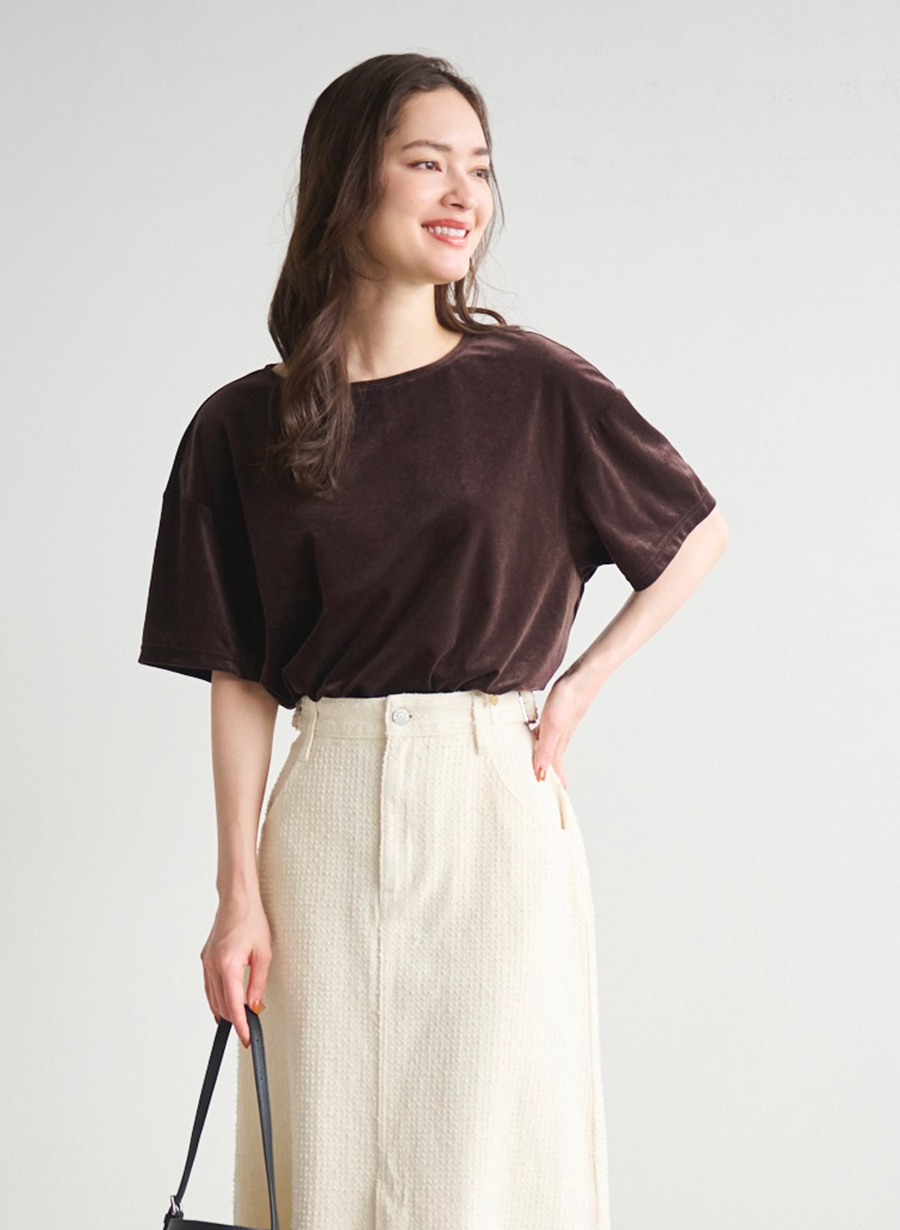 ベロア素材が季節感を先取り。程よい透け感が軽やかな印象に。