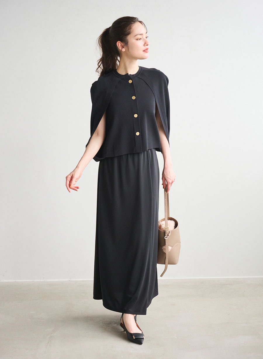 ボタンデザインニットポンチョ/ラップ風カットソーロングスカート