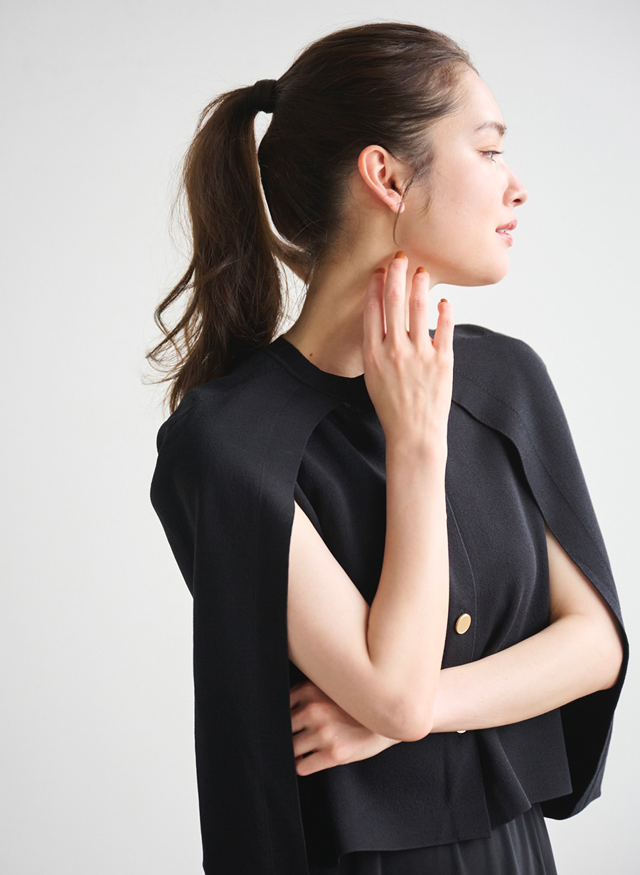 カーディガンを肩掛けしたような、ポンチョデザインのニットプルオーバー。