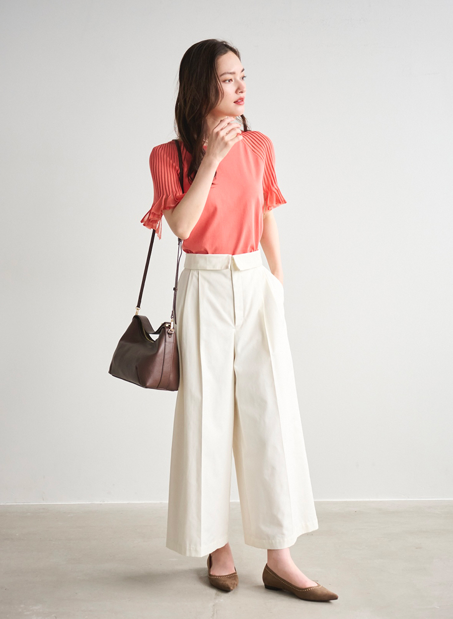 フェミニンな雰囲気のピンクは、チノワイドパンツを合わせてほんのりハンサムなバランスに。