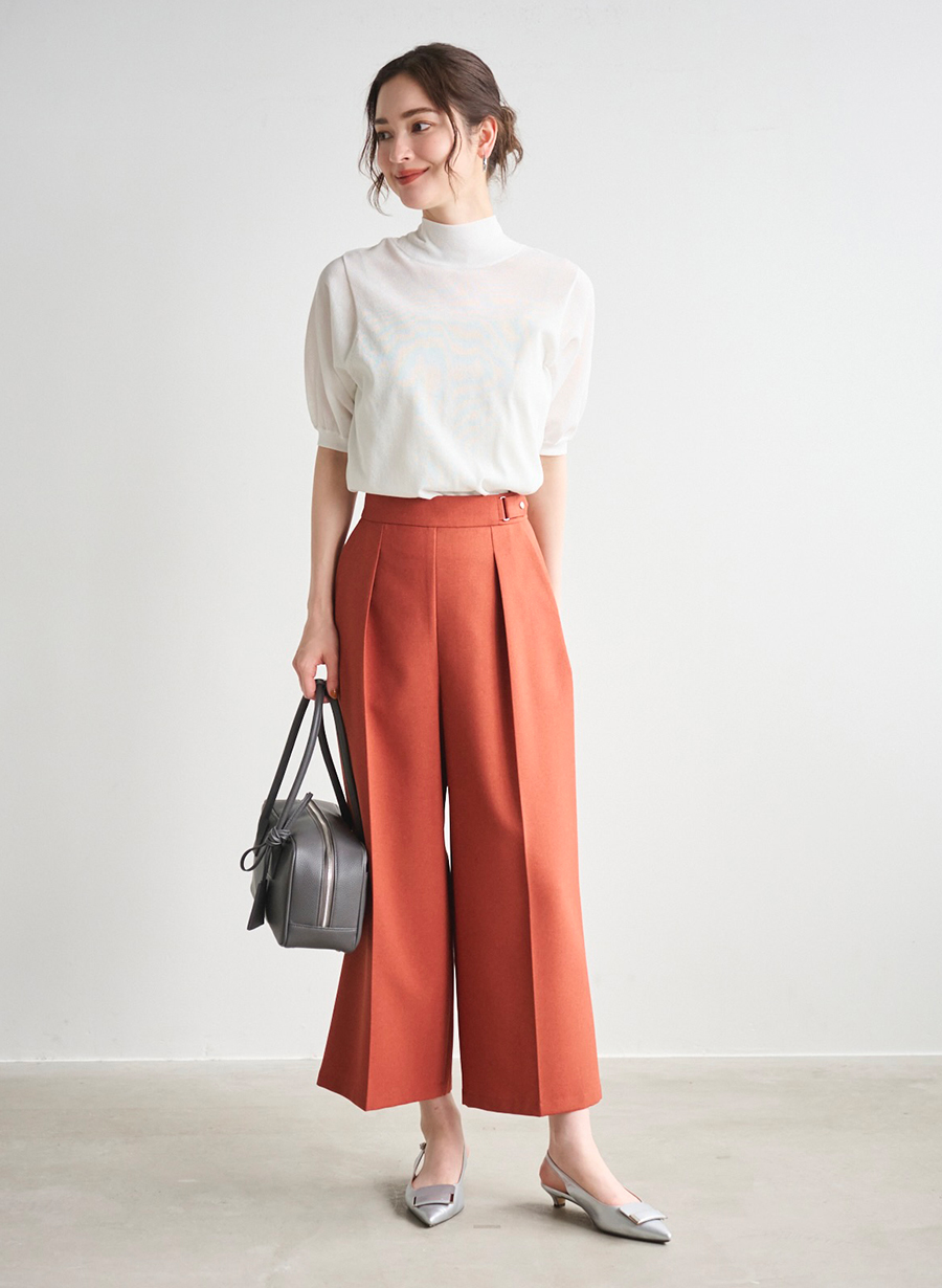 ハイネックのデザインが晩夏のモードスタイルに仕上げてくれます。