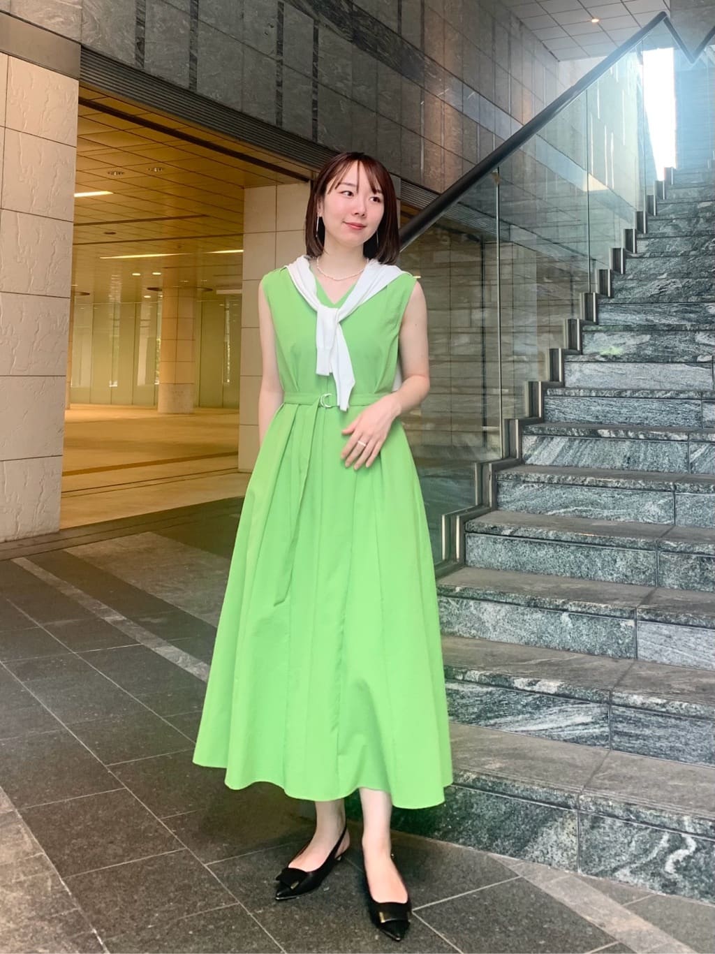 華やぐグリーンのワンピースは、肌離れの良い素材で暑さの残る今にぴったりです。