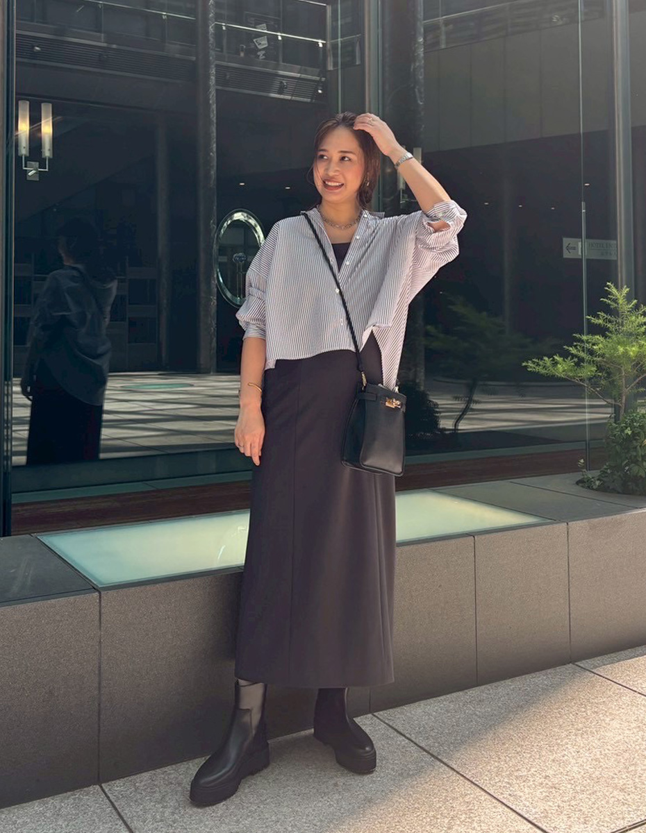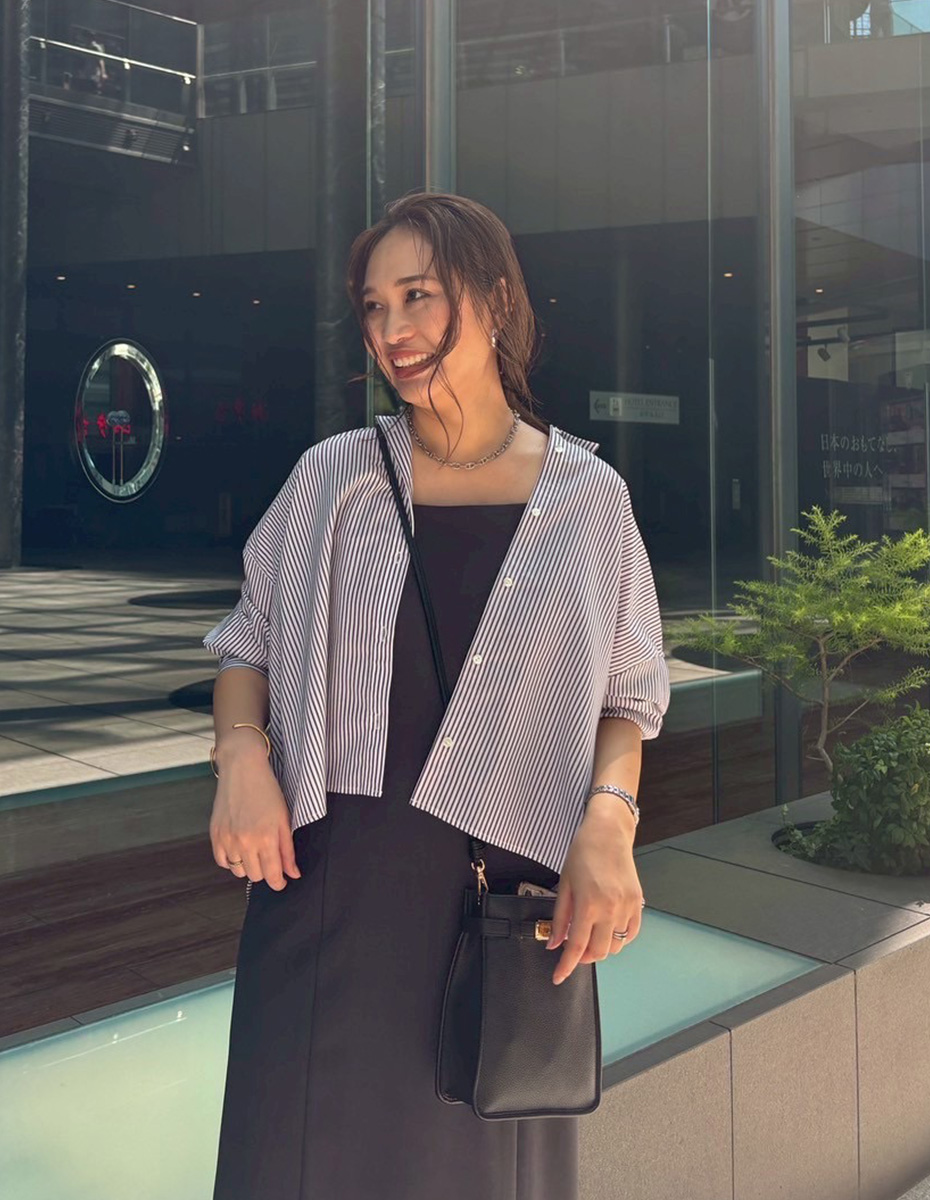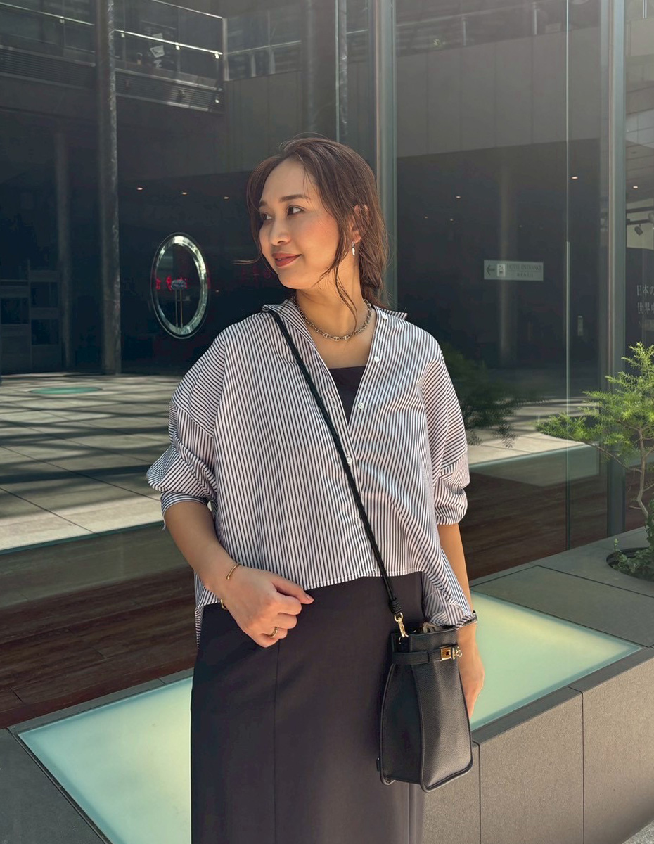 長引く残暑で日中は気温が高い時期。肌離れがよくさらっと羽織れるシャツを合わせて、爽やかなスタイリングに。前丈が短めのシャツは、腰位置を高く見せることができ、スタイルアップ見えも叶います。
