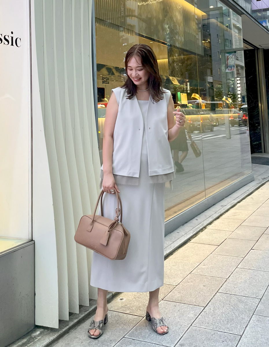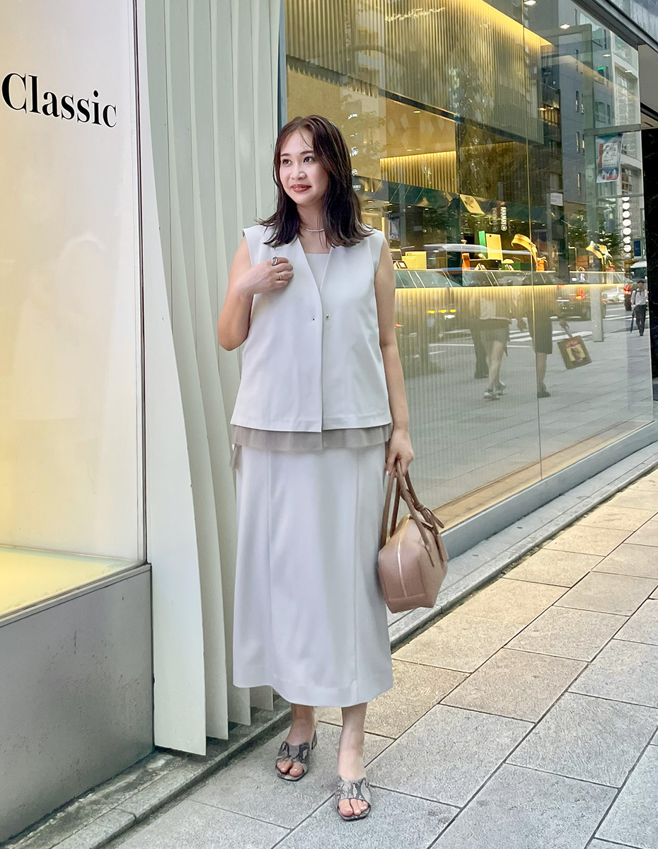 同素材のジレを合わせてセットアップスタイルに。