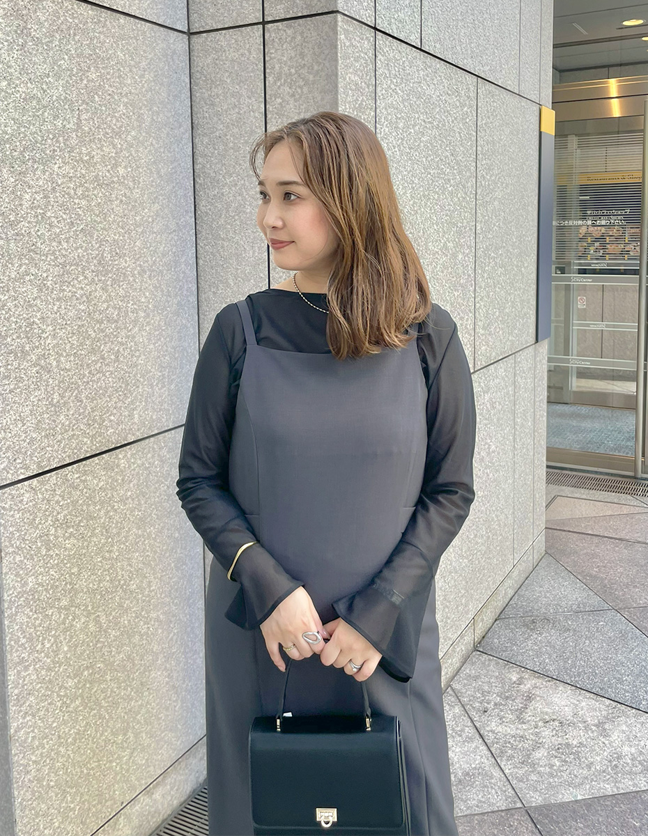 気温の下がり始める時期には、シアー素材のインナーを合わせることで秋らしく。程よい透け感が軽やかさを演出します。