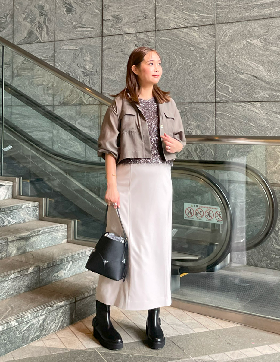 ライトベージュのワントーンが上品な「女っぽ」雰囲気に仕上げてくれます。