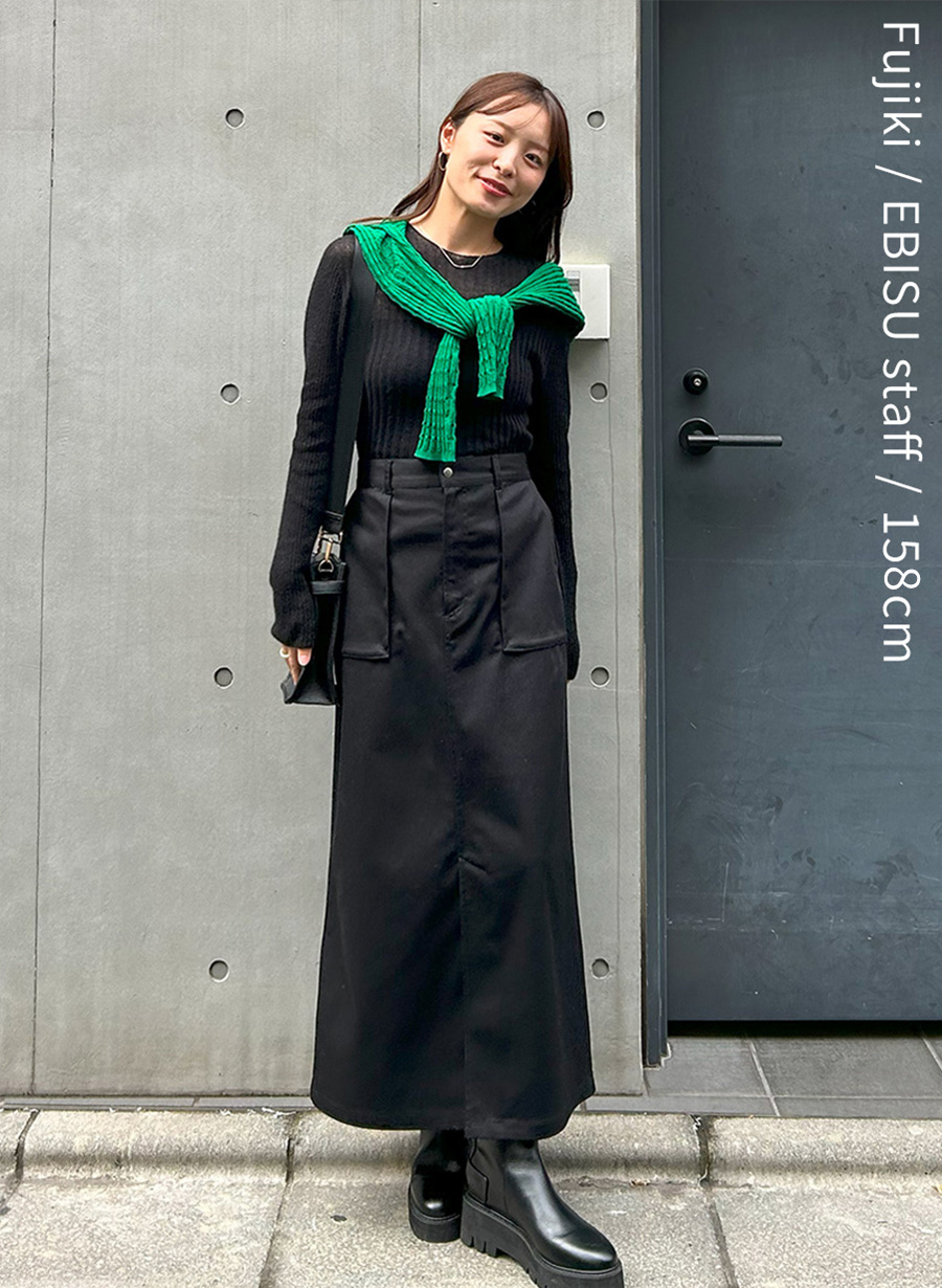 オールブラックでまとめたモードな雰囲気のカジュアルスタイル。グリーンのカーディガンを肩にかけることでコーディネートが引き締まります。