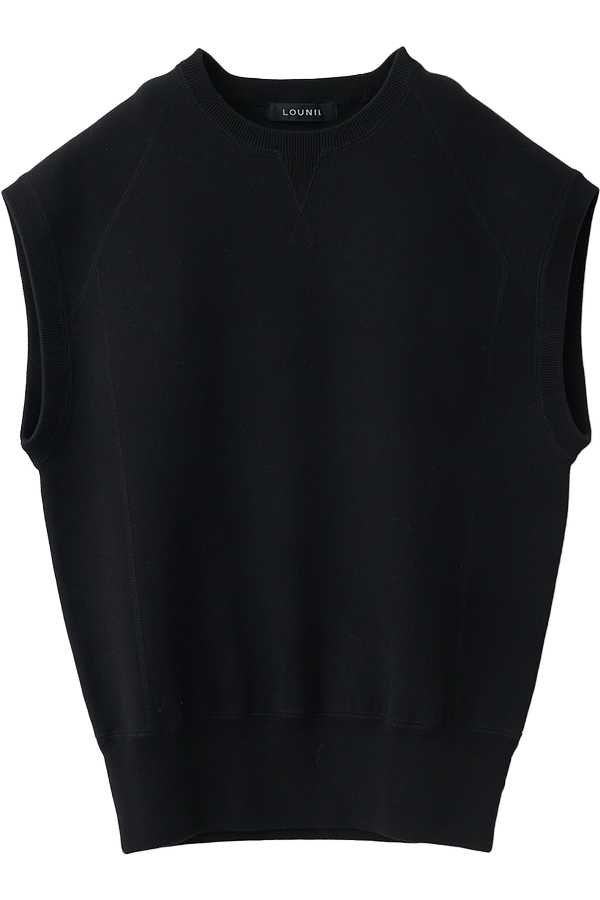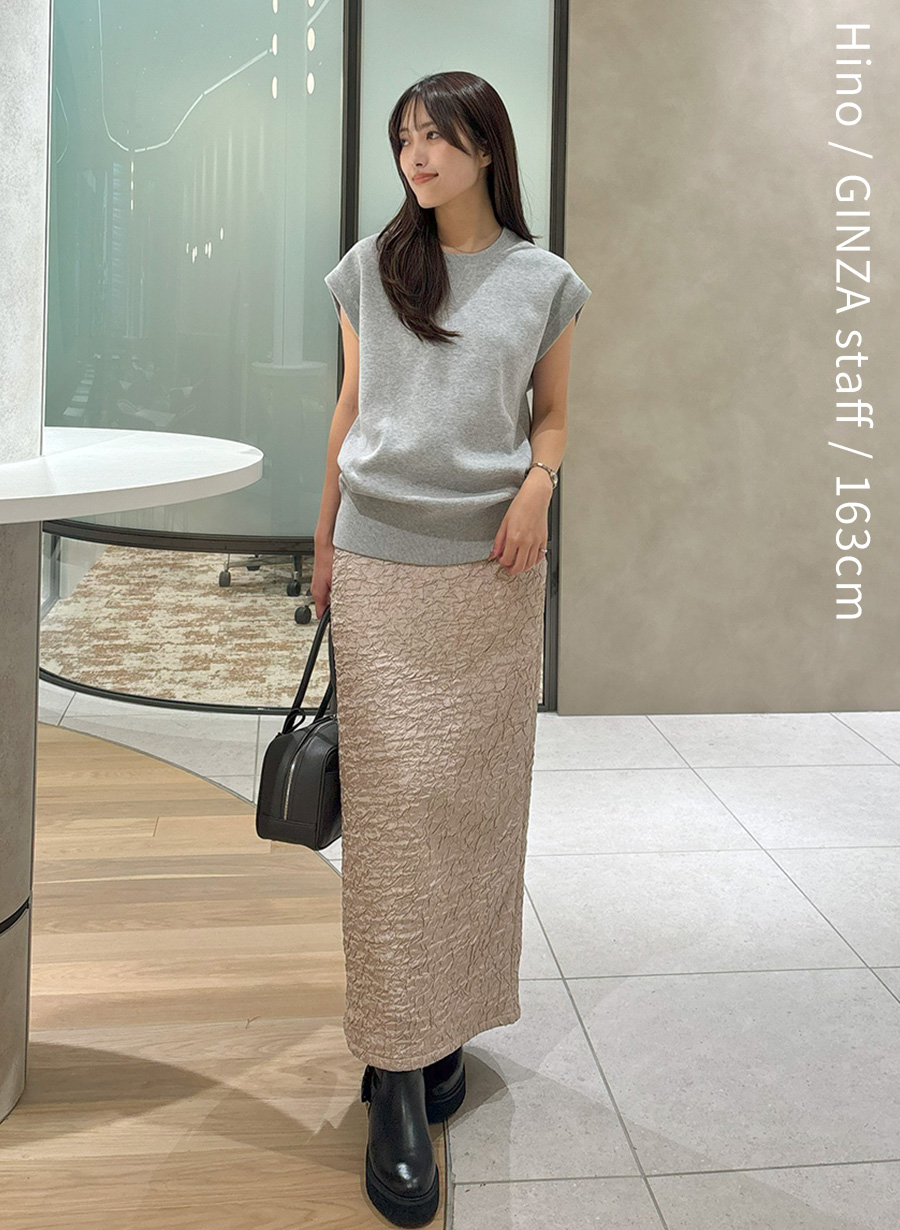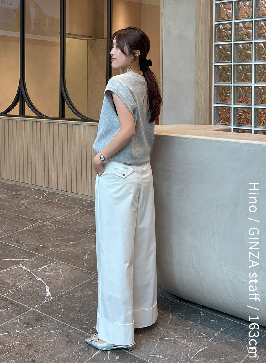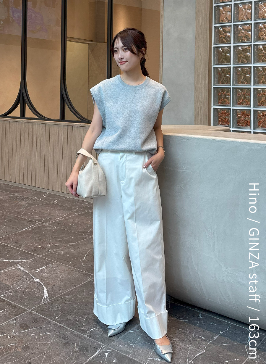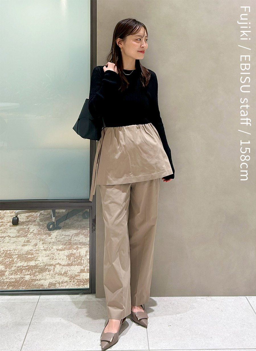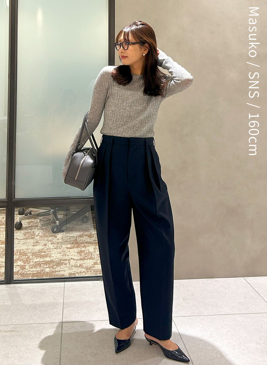 身体に馴染むコンパクトなホールガーメントリブニットは、ハイウエストボトムスと相性抜群。トレンドの丸みのあるシルエットが特徴のパンツも、すっきりまとまります。