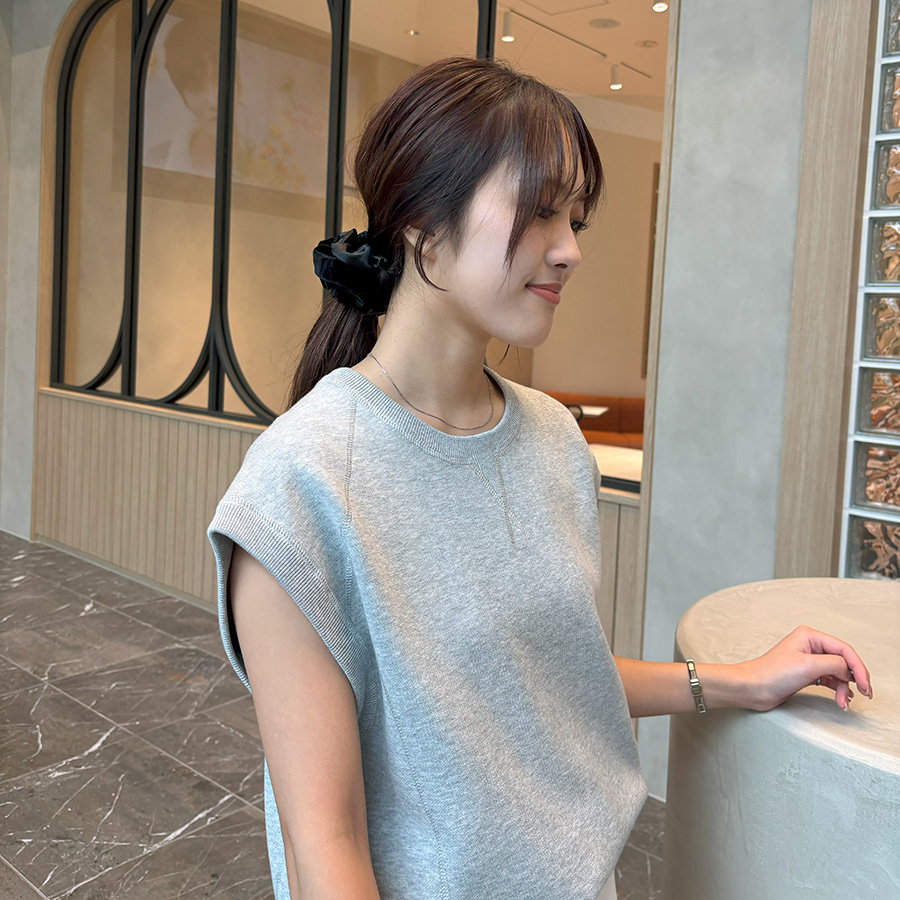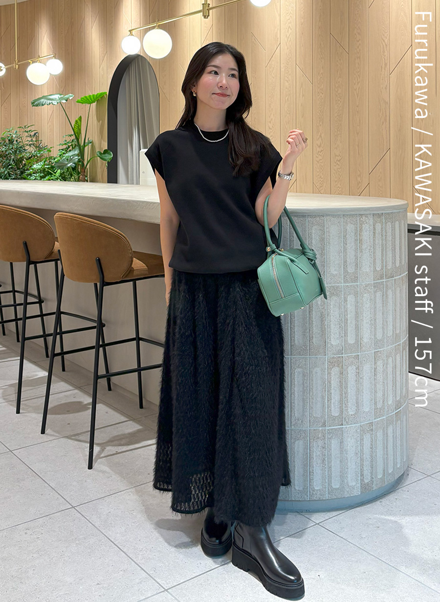 首の開きが小さいため、透け感のある素材でも肌見えし過ぎず、お仕事でも使いやすいデザイン。ブラックのニットはベージュのアイテムと合わせて軽やかに。