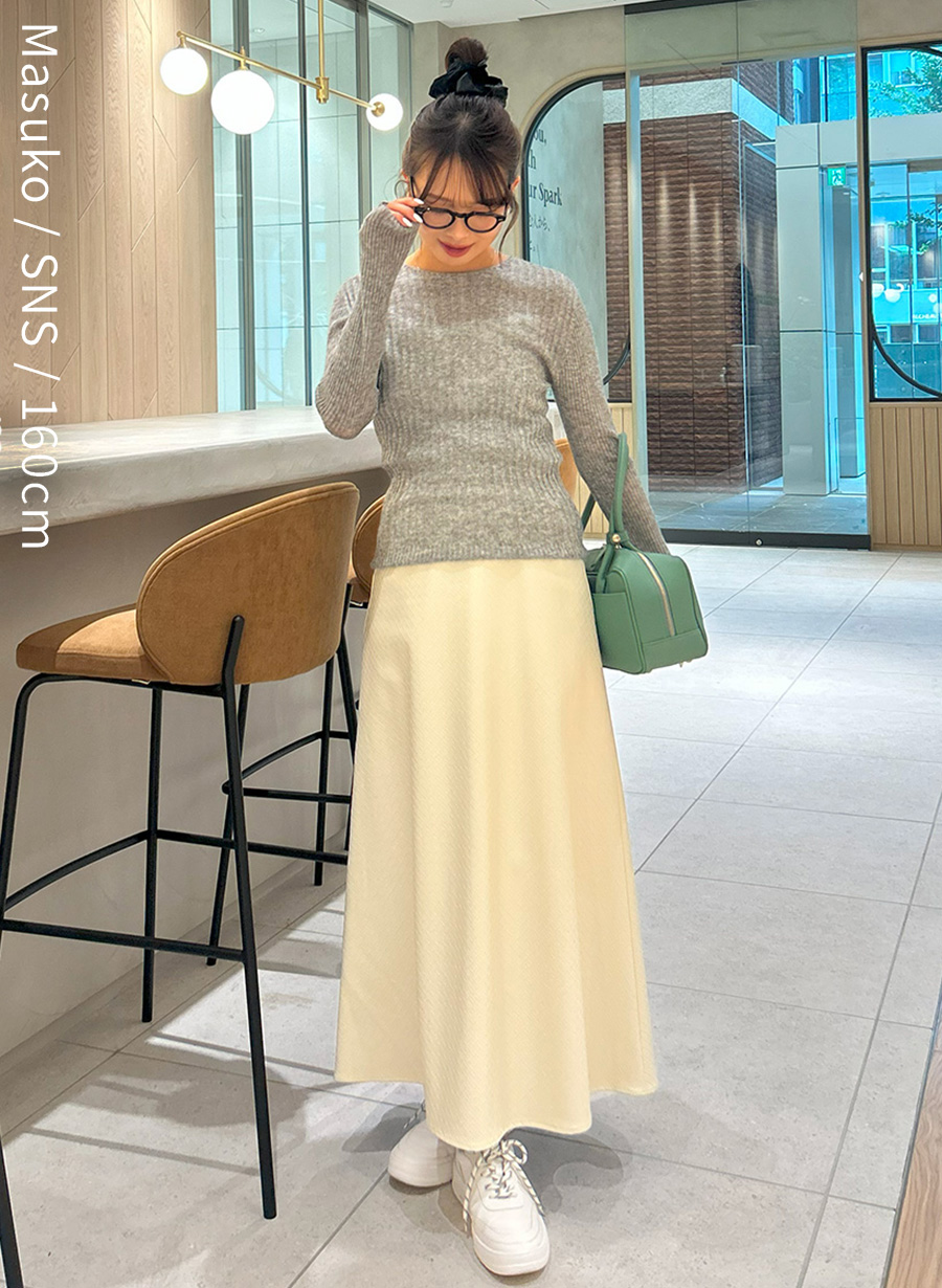 フレアスカートで女性らしく、スニーカーでラフに仕上げたコーデ。カフェで過ごすゆったり時間に寄り添うような柔らかいスタイリングです。