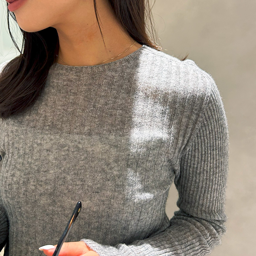 カシミヤとシルクの、柔らかく滑らかな肌触りが心地よいリブニット。程よいシアー感で、上品な透け感を楽しめます。