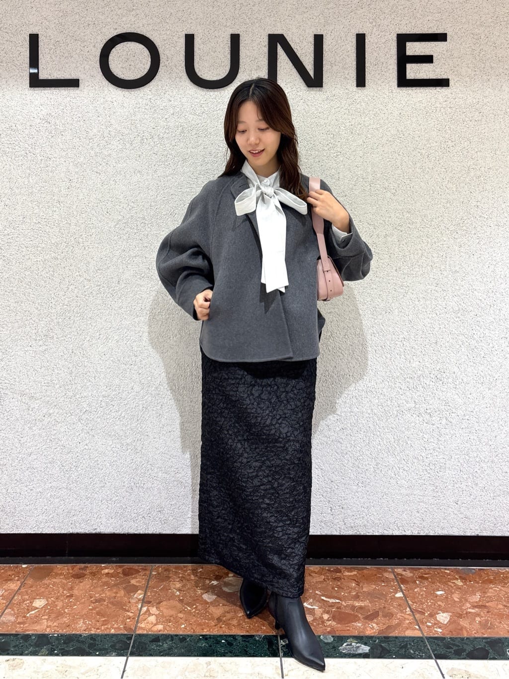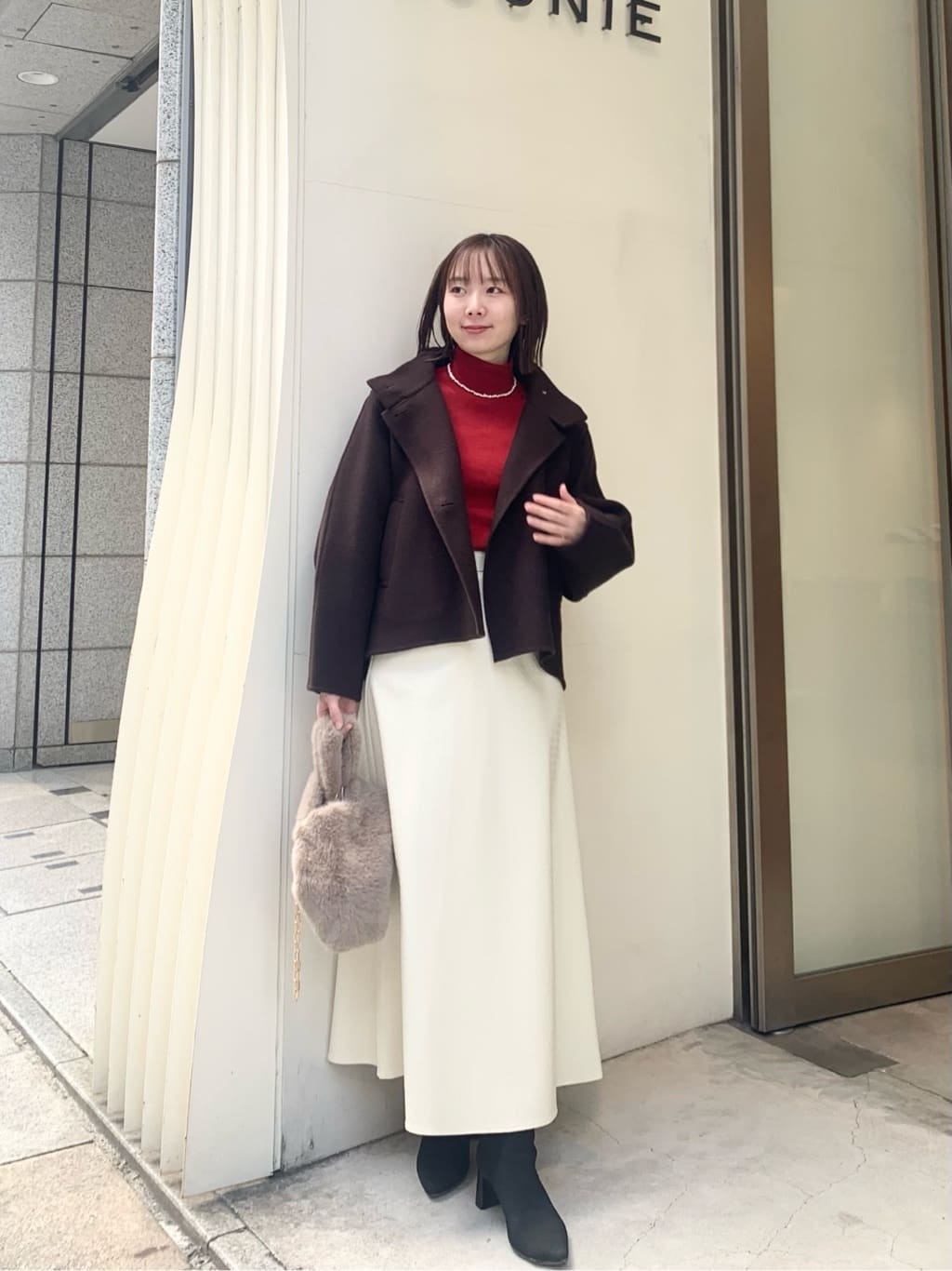 冬らしい配色のコーディネート。様々なボトムスと相性の良いショートコートは今季トレンドのブラウンを取り入れて。