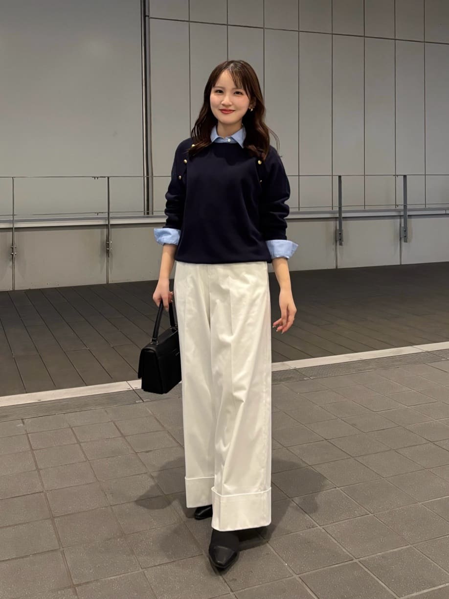 軽くて暖かいカシミヤのニットプルオーバー。ブルーのシャツをレイヤードして今年らしいスタイルに。