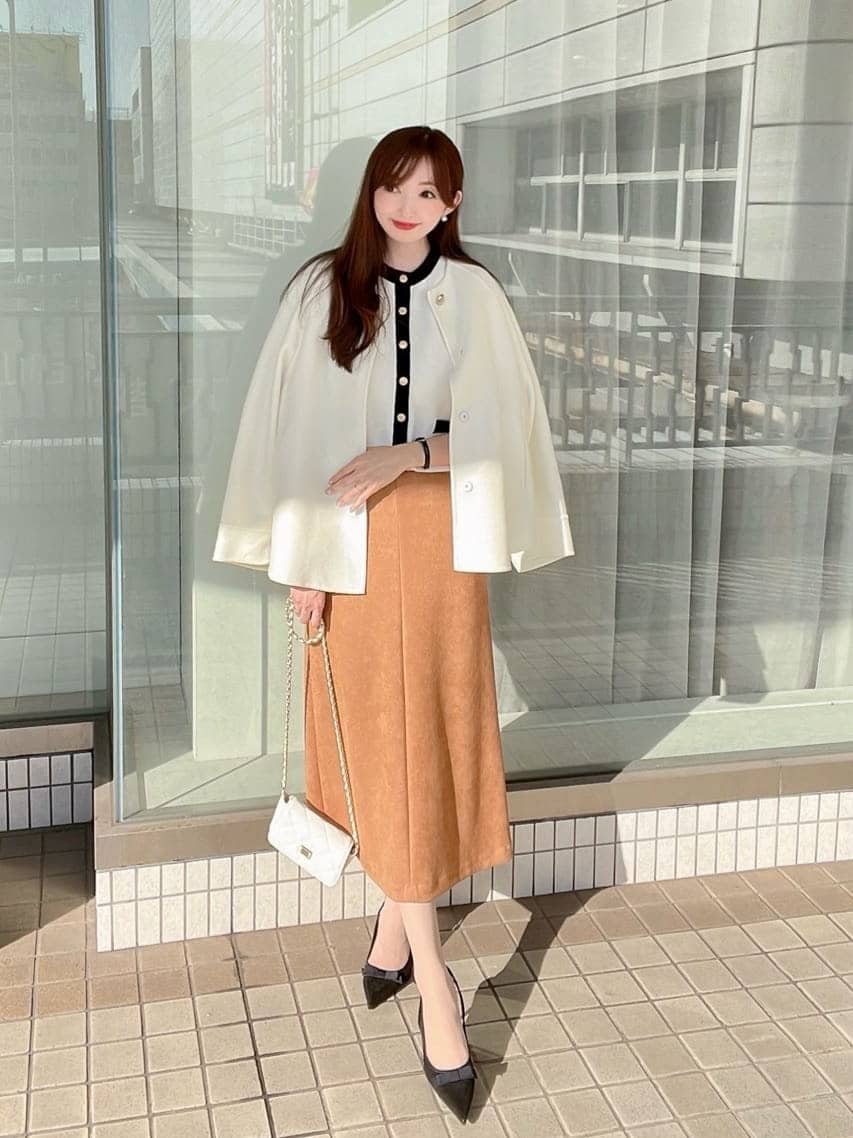 明るい配色のフェミニンスタイル。スウェードスカートの素材感が冬らしい季節感を演出。