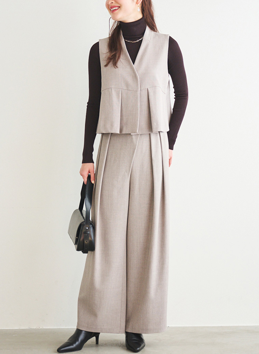 セットのジレ・ジャケットの合わせはもちろん、厚手のニットと合わせたウィンターコーデにもぴったりです。