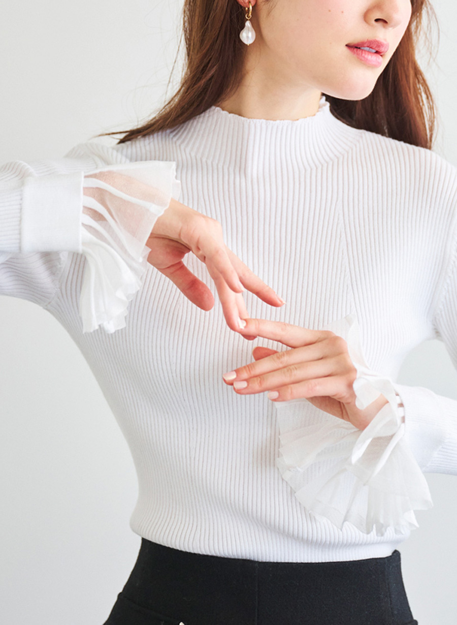 繊細なシアー素材の袖口フリルが目を引くリブニット。