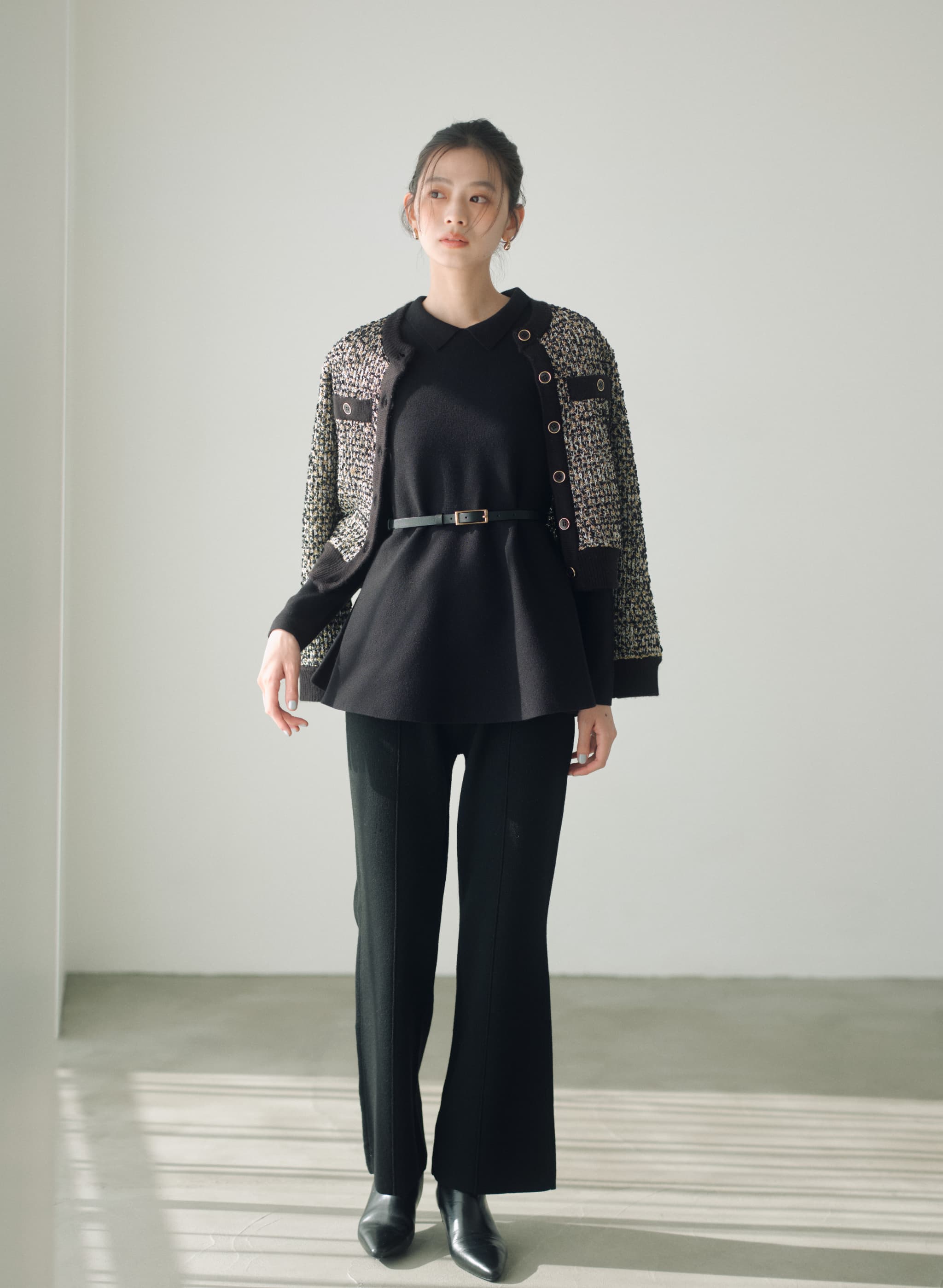 フェミニンなペプラムニットには、街の光に映えるきらめきツイードカーディガンをプラス。ホリデームード高まる大人のモノトーンコーデに。
