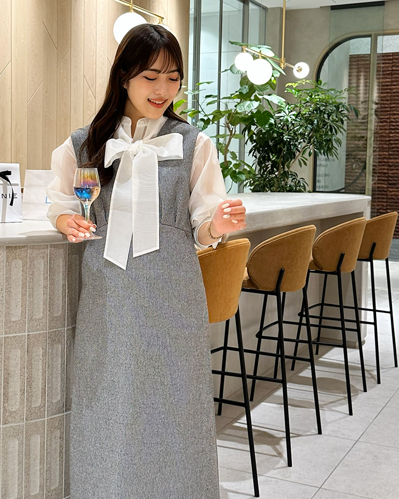 顔回りを華やかに演出するボウタイがポイント。