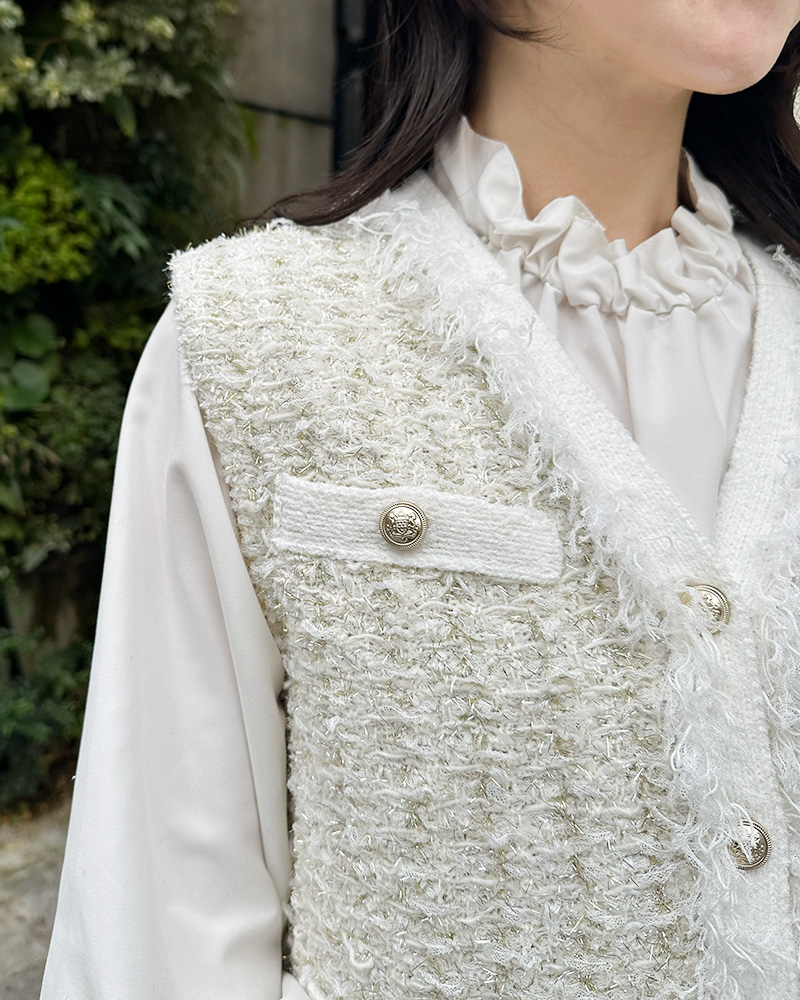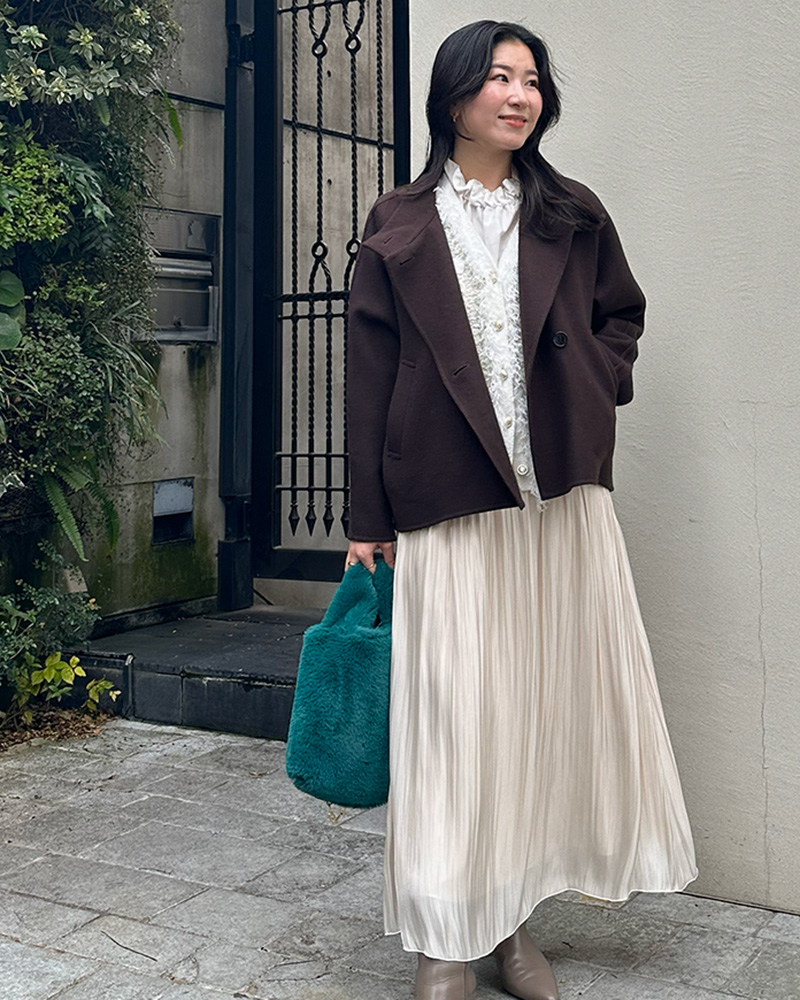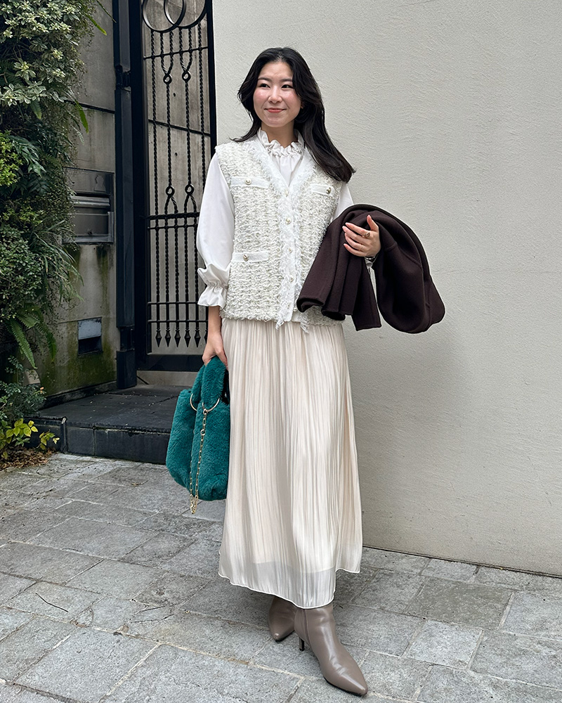 ツイード風ニットジレのラメ感や、サテンギャザースカートの艶感など、異素材を組み合わせた遊び心のあるスタイリングです。