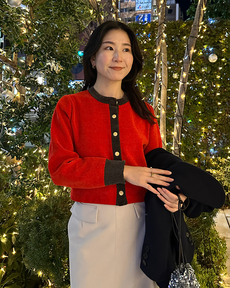 欠かせない“赤ニット”を取り入れたコーデ。