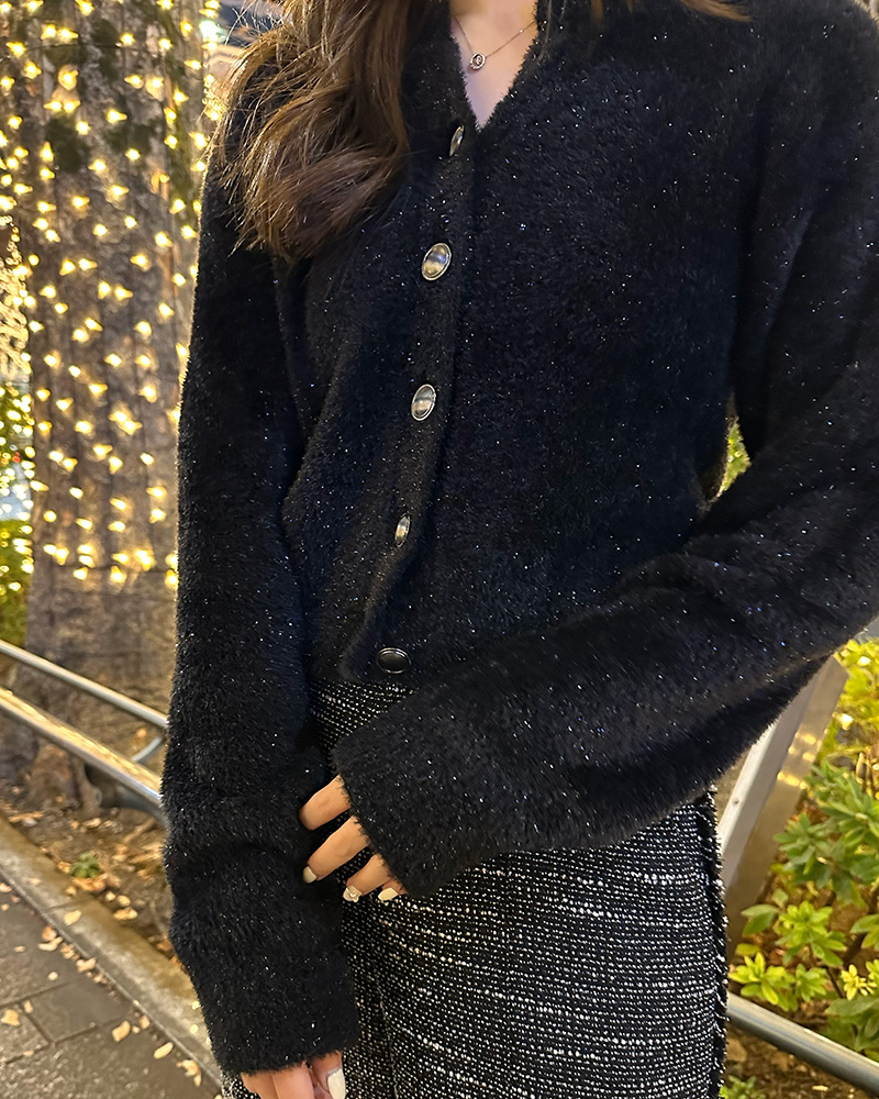 きらめくラメがポイントの“フェザーニットカーディガン”で決めるモノトーンコーデと、ホリデーシーズンには
