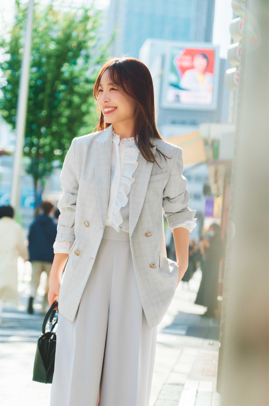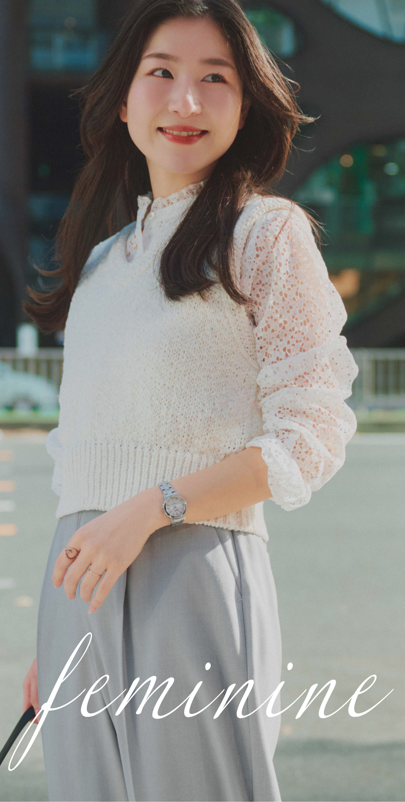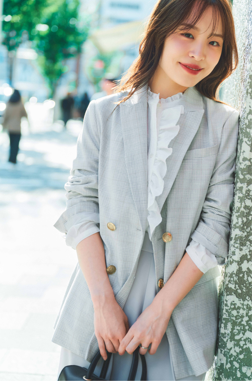 女性らしい印象のフリルブラウスをのぞかせて、