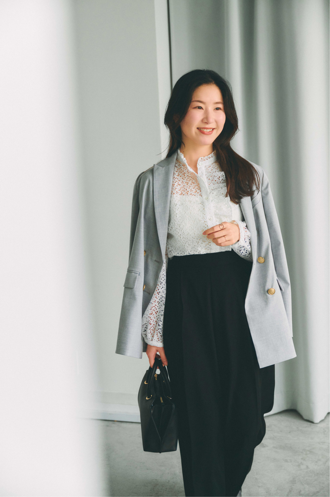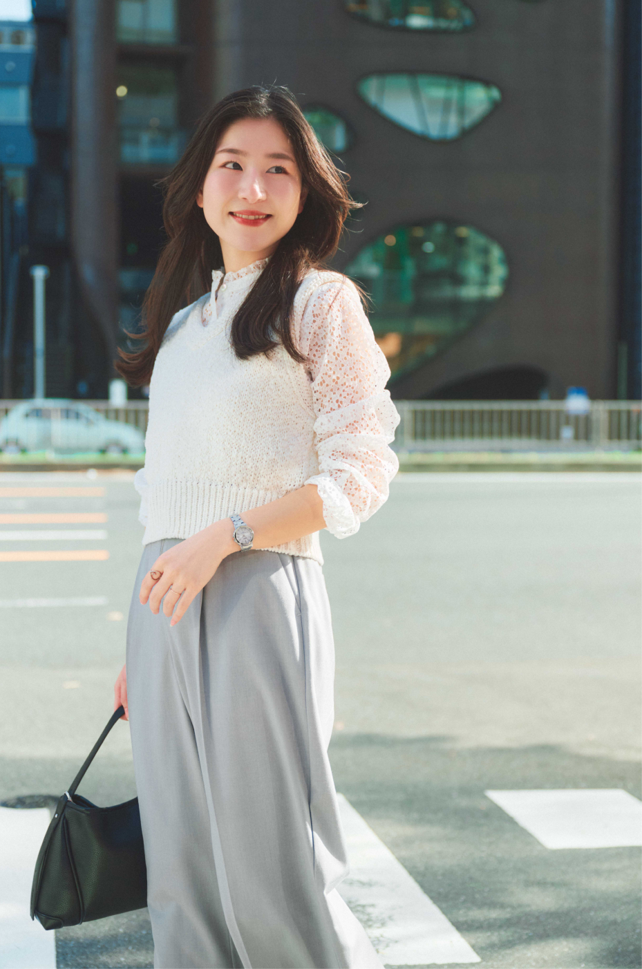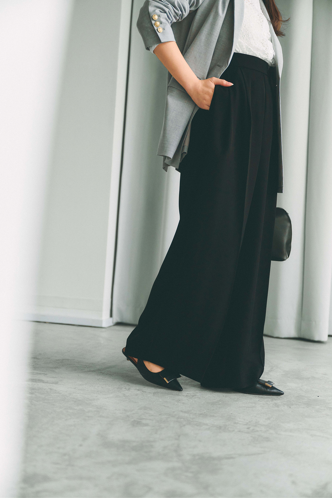 女性らしい印象のフリルブラウスをのぞかせて、
