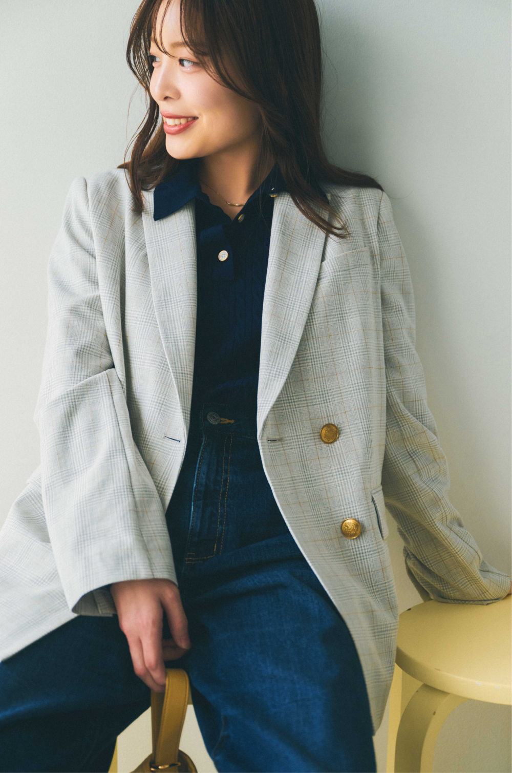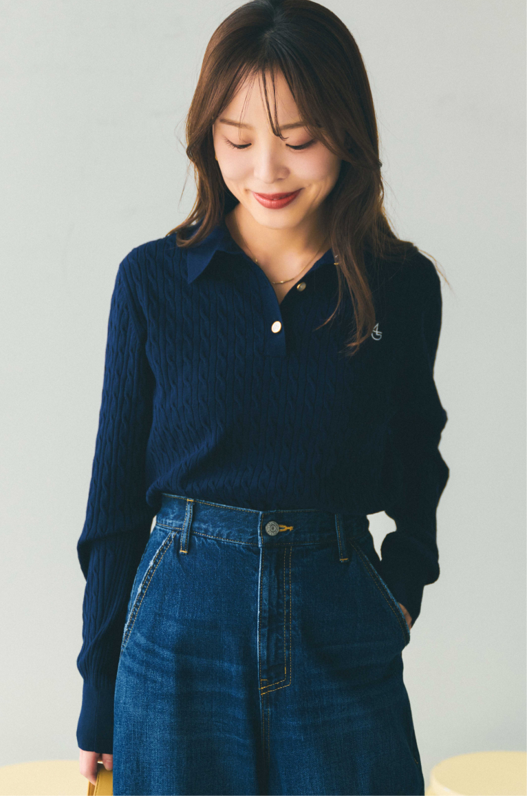 襟付きニットのネイビーとデニムパンツのインディゴを