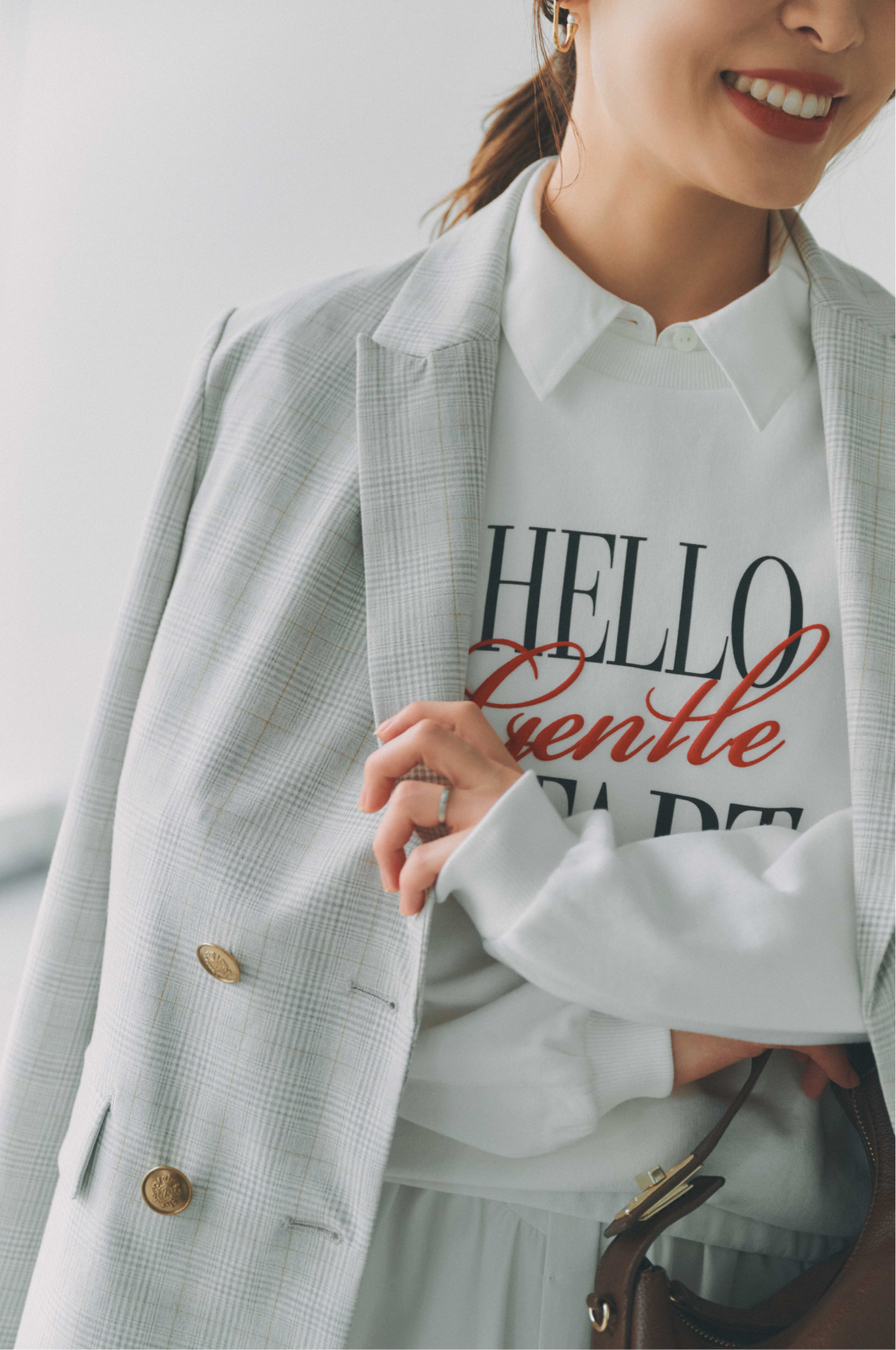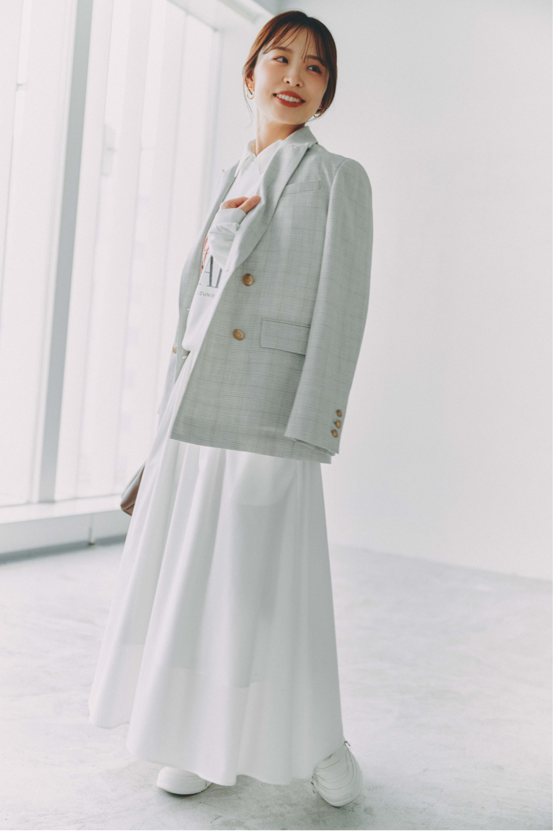 明るいグレーを基調としたチェック柄のジャケットは、
