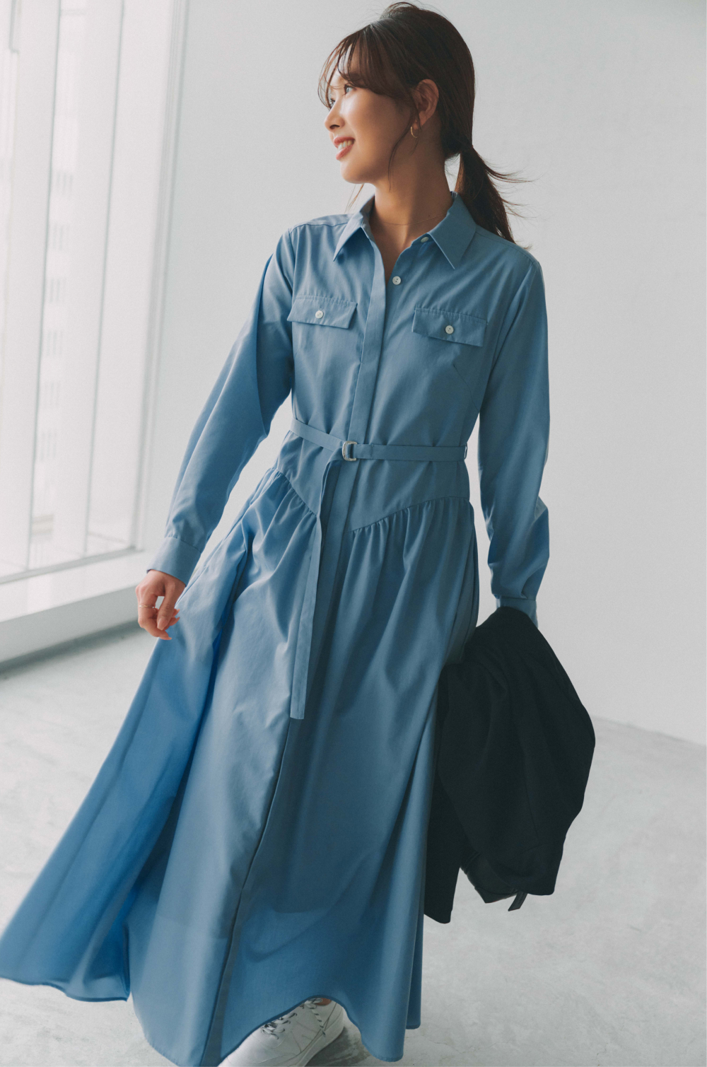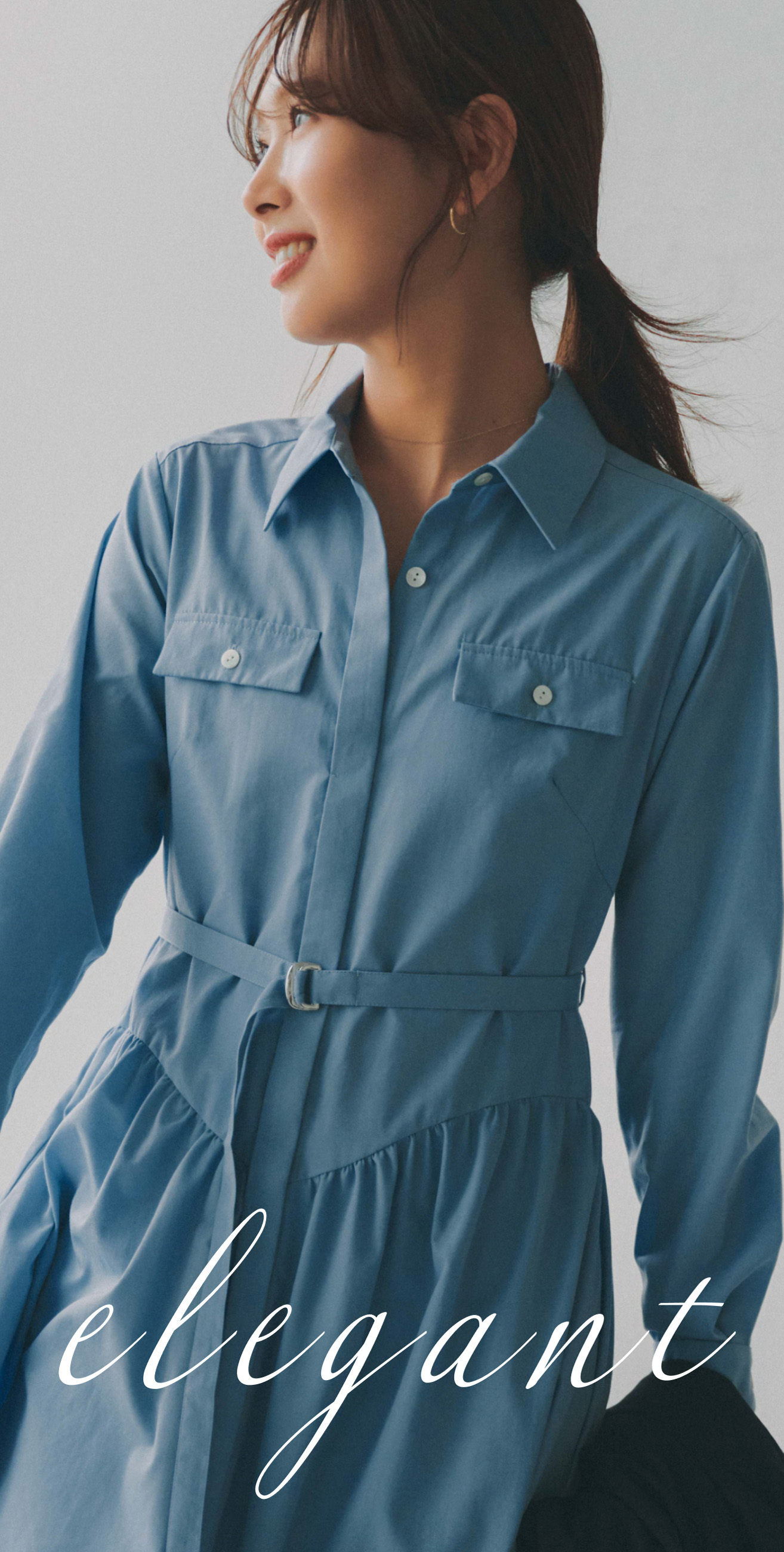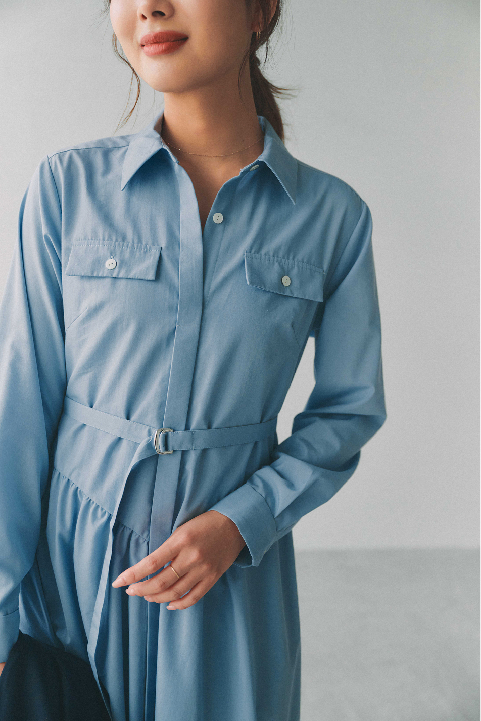 爽やかなブルーのシャツワンピースは、一枚でコーディネートが決まる春のマストアイテム。ウエストベルトや胸ポケットのデザインが、視線を上へ集めるので、スタイルアップ見えが叶います。