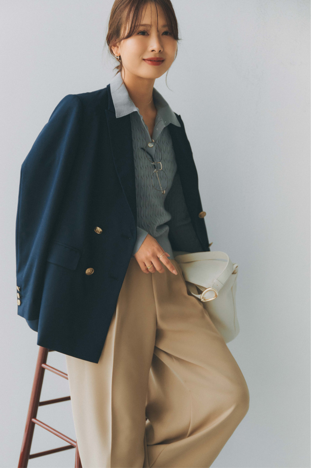 ネイビーのニットを肩掛けすることでコーディネートにメリハリを出しました。
