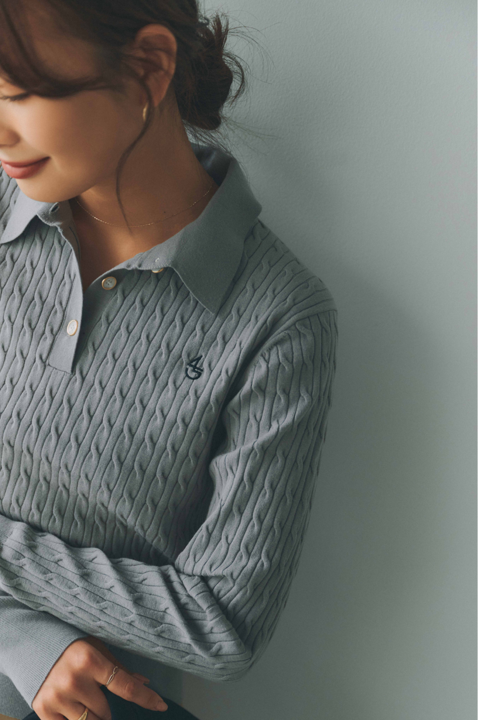 衿付き×ケーブル編みの知的な印象のポロニット。