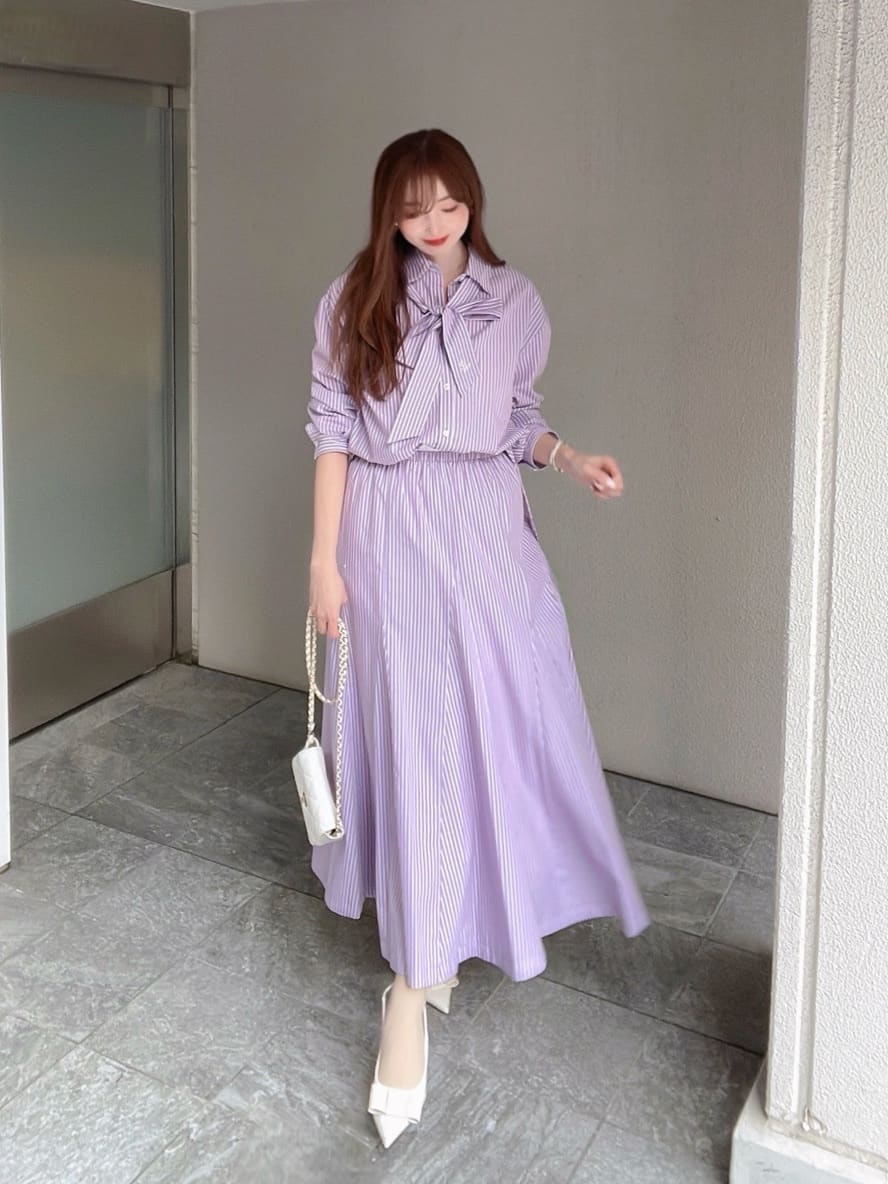 春らしいストライプ柄のセットアップスタイル。ラベンダーカラーが上品で柔らかい雰囲気に。