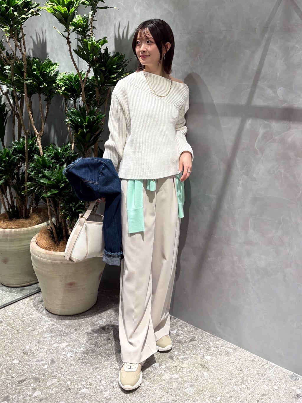 オフやアイボリーのワントーンコーデに、ミントグリーンの差し色をプラス。