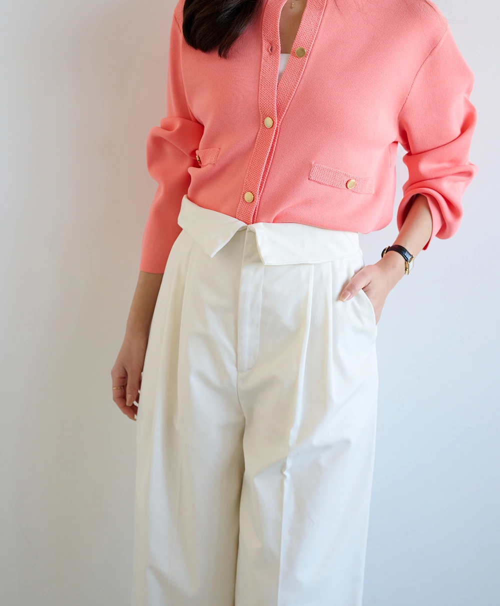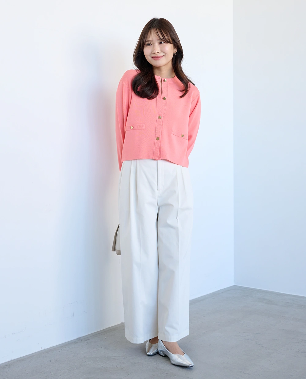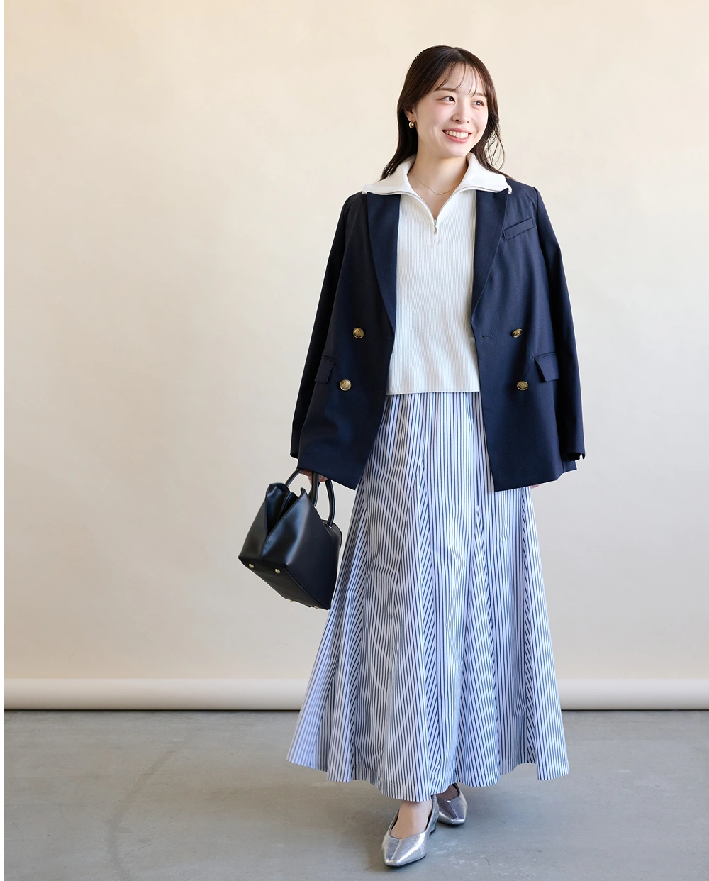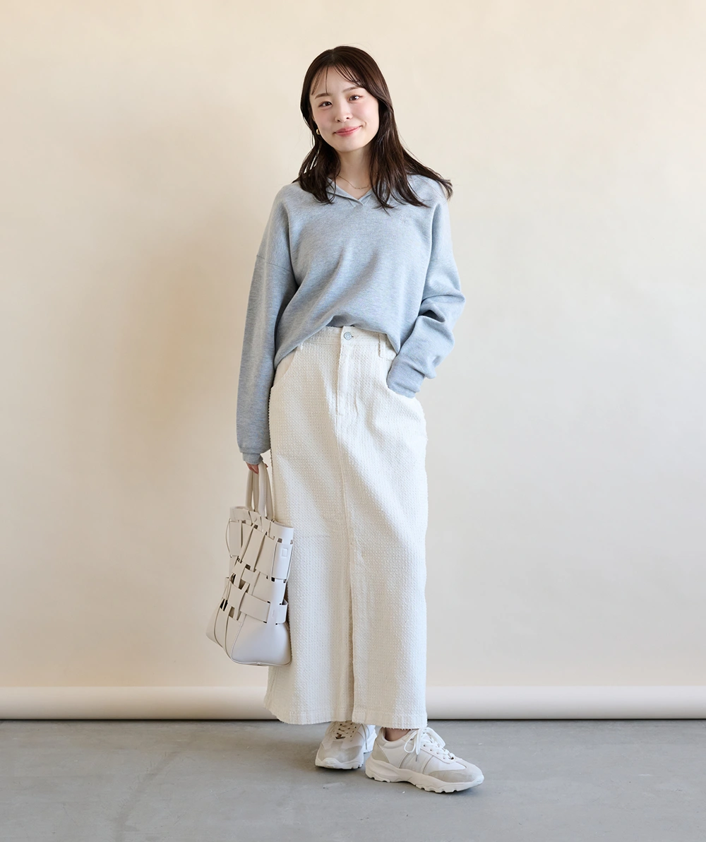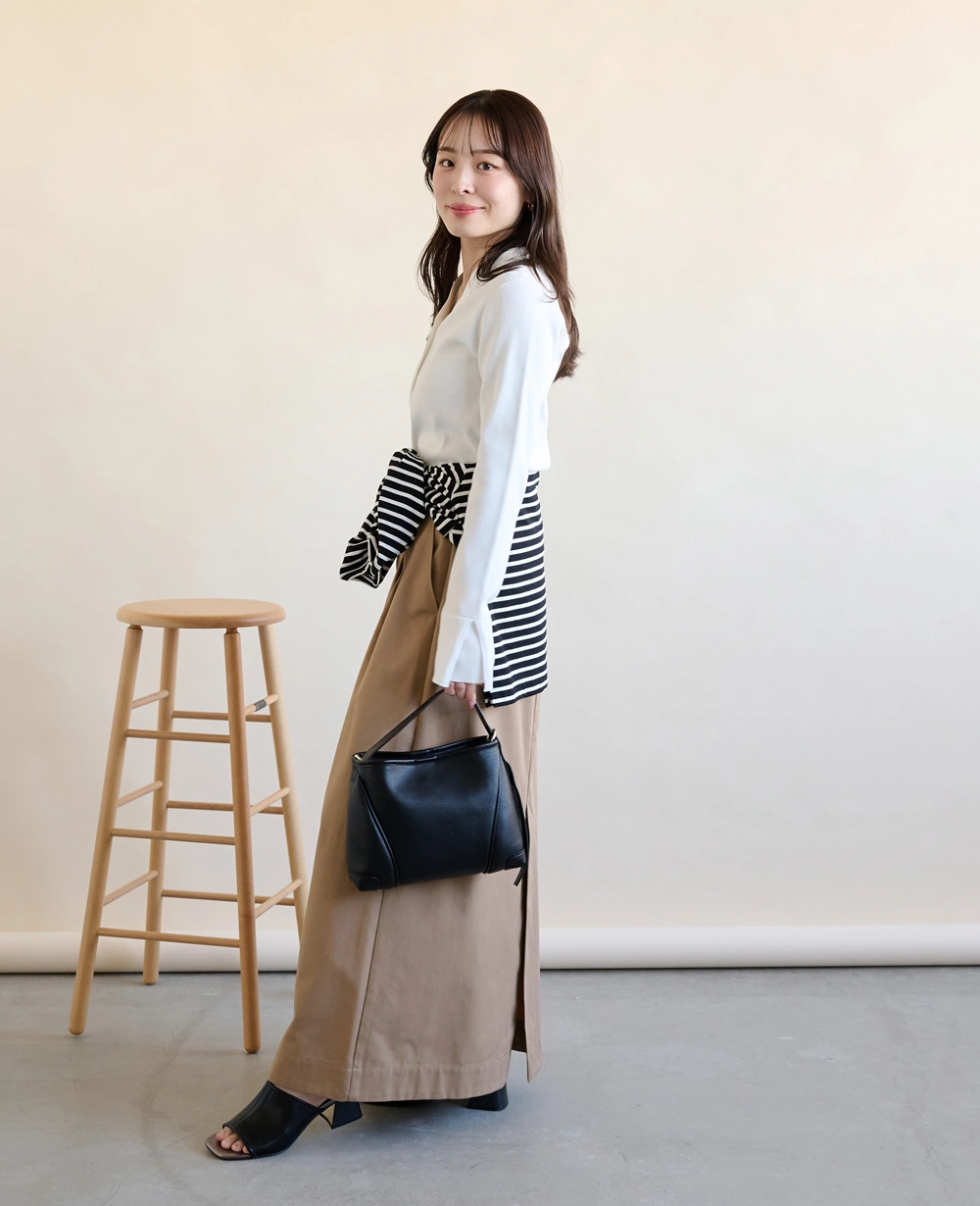 オフのカラーはコーデ全体を明るく見せてくれるので、季節の変わり目にぴったりです。