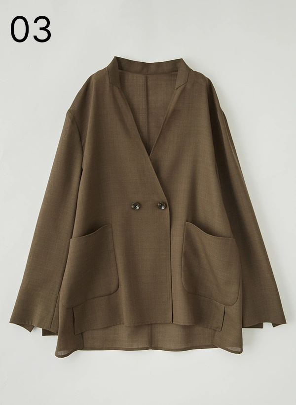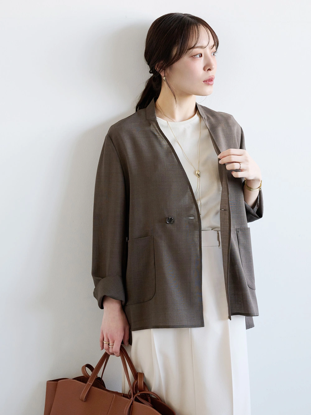 顔回りがすっきりとしたノーカラーデザインなので、様々なお洋服と合います。