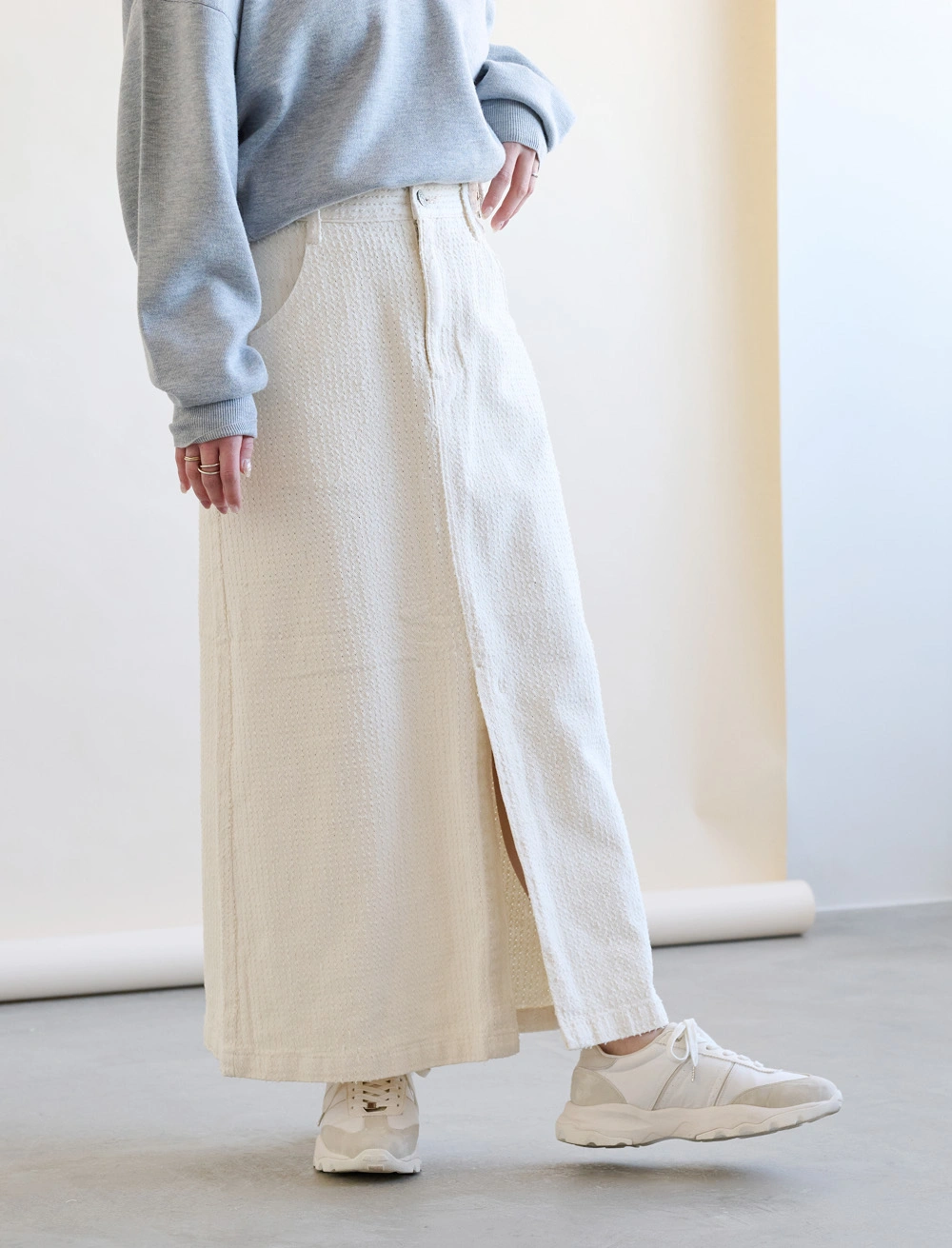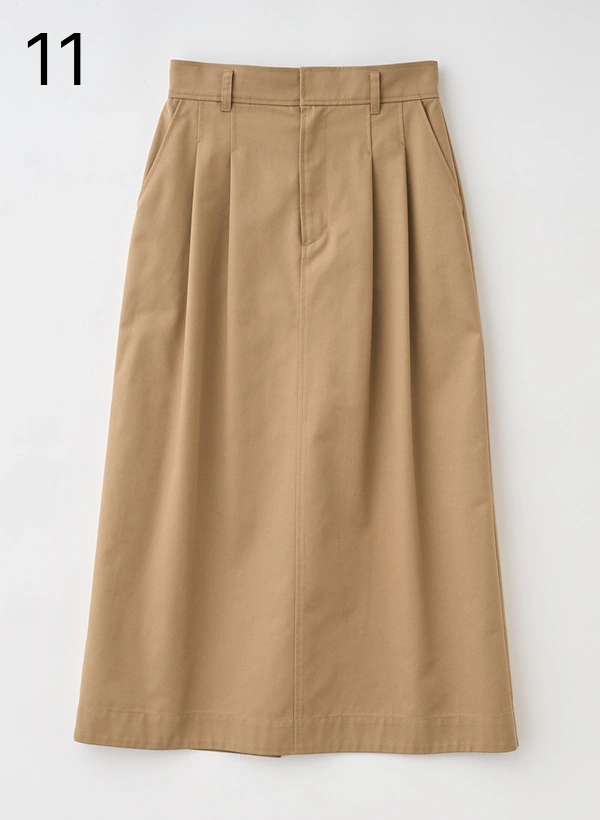 チノ素材で程よくハリ感があり、きれいめにもカジュアルにも合わせやすいスカートです。