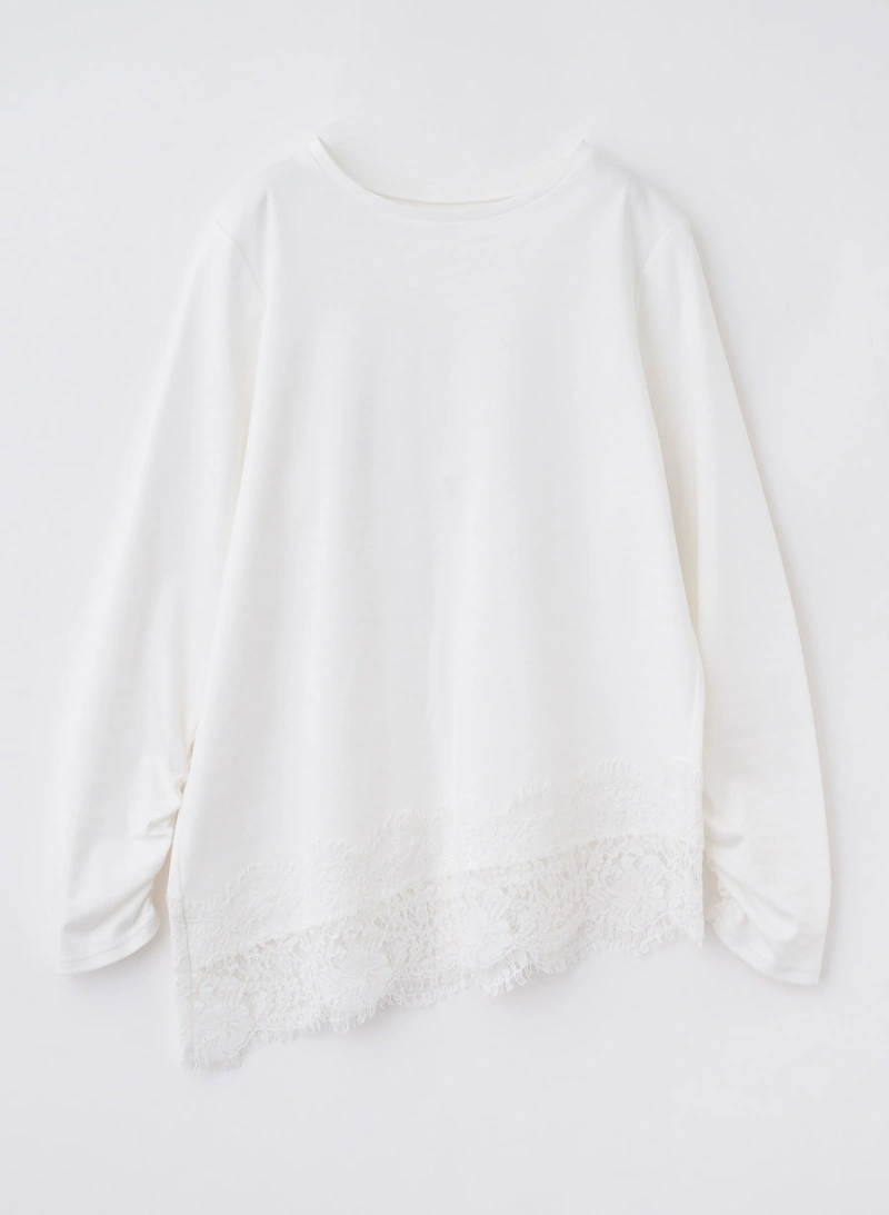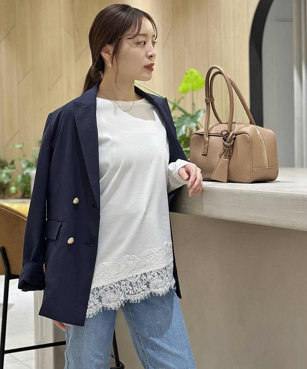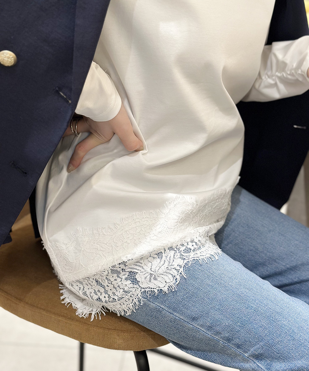 斜めカットの裾にレースをあしらったカットソー。カジュアルになりやすいカットソー素材には、ジャケットをONしてきちんと感をプラスして。