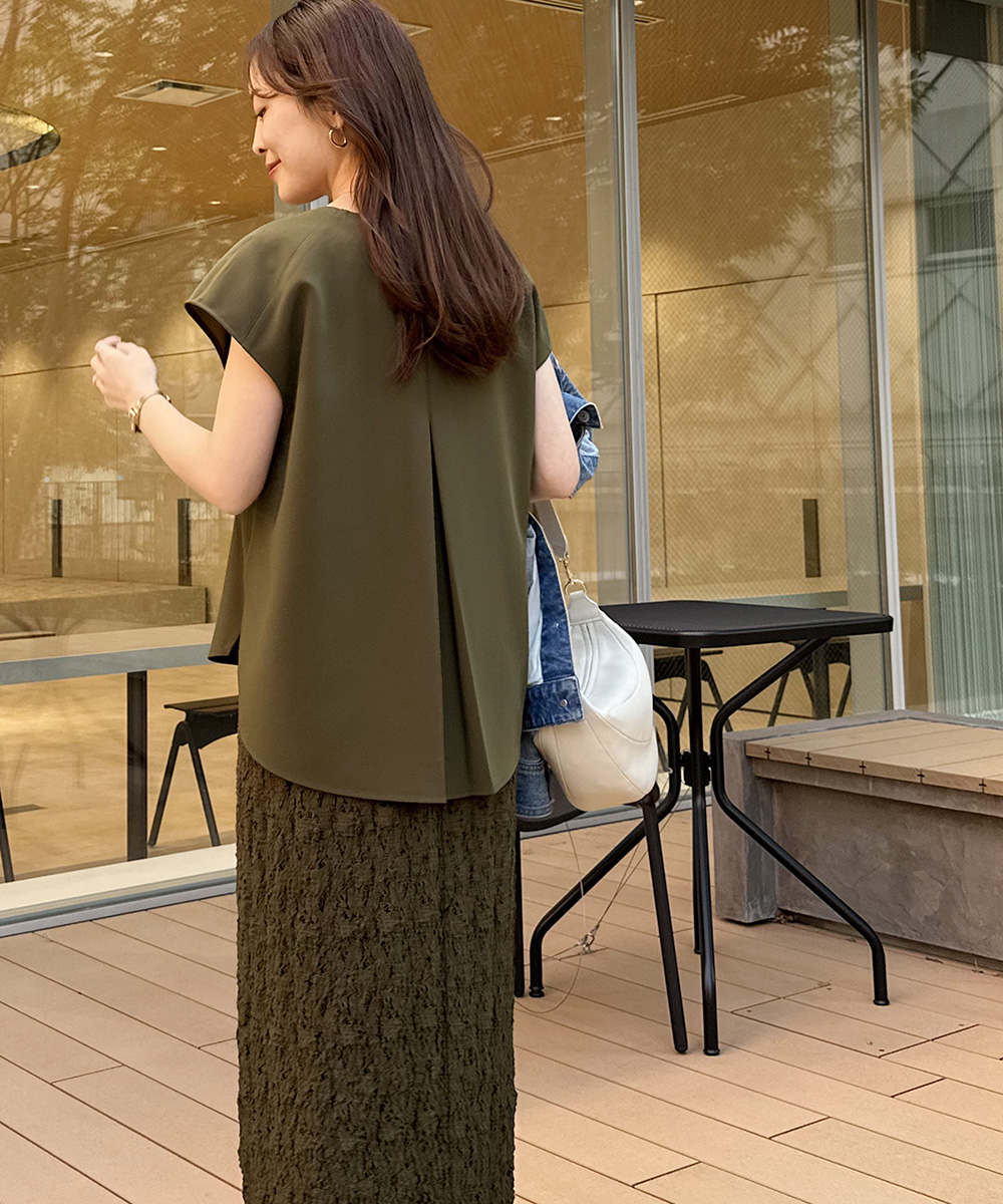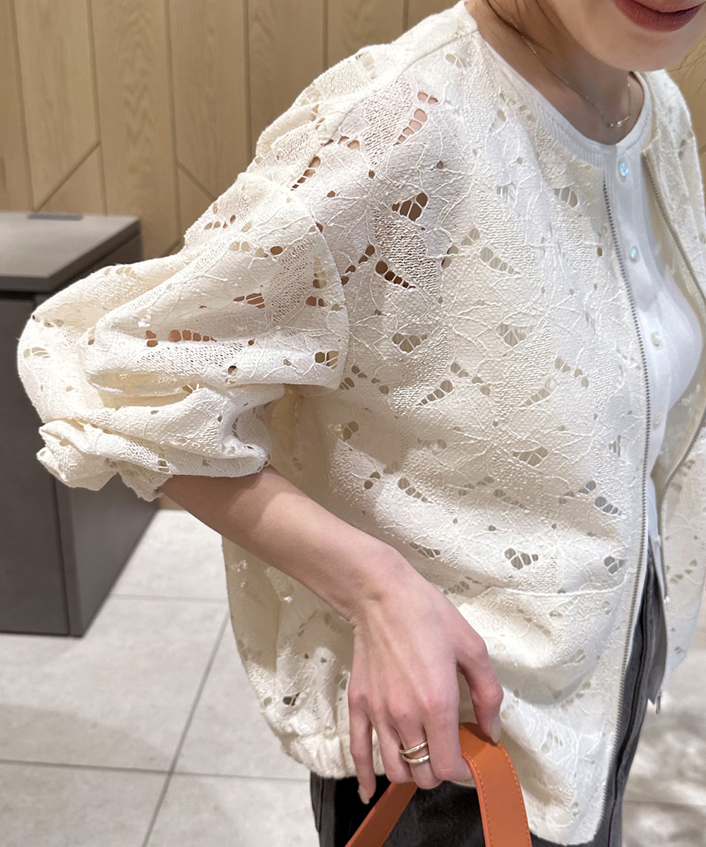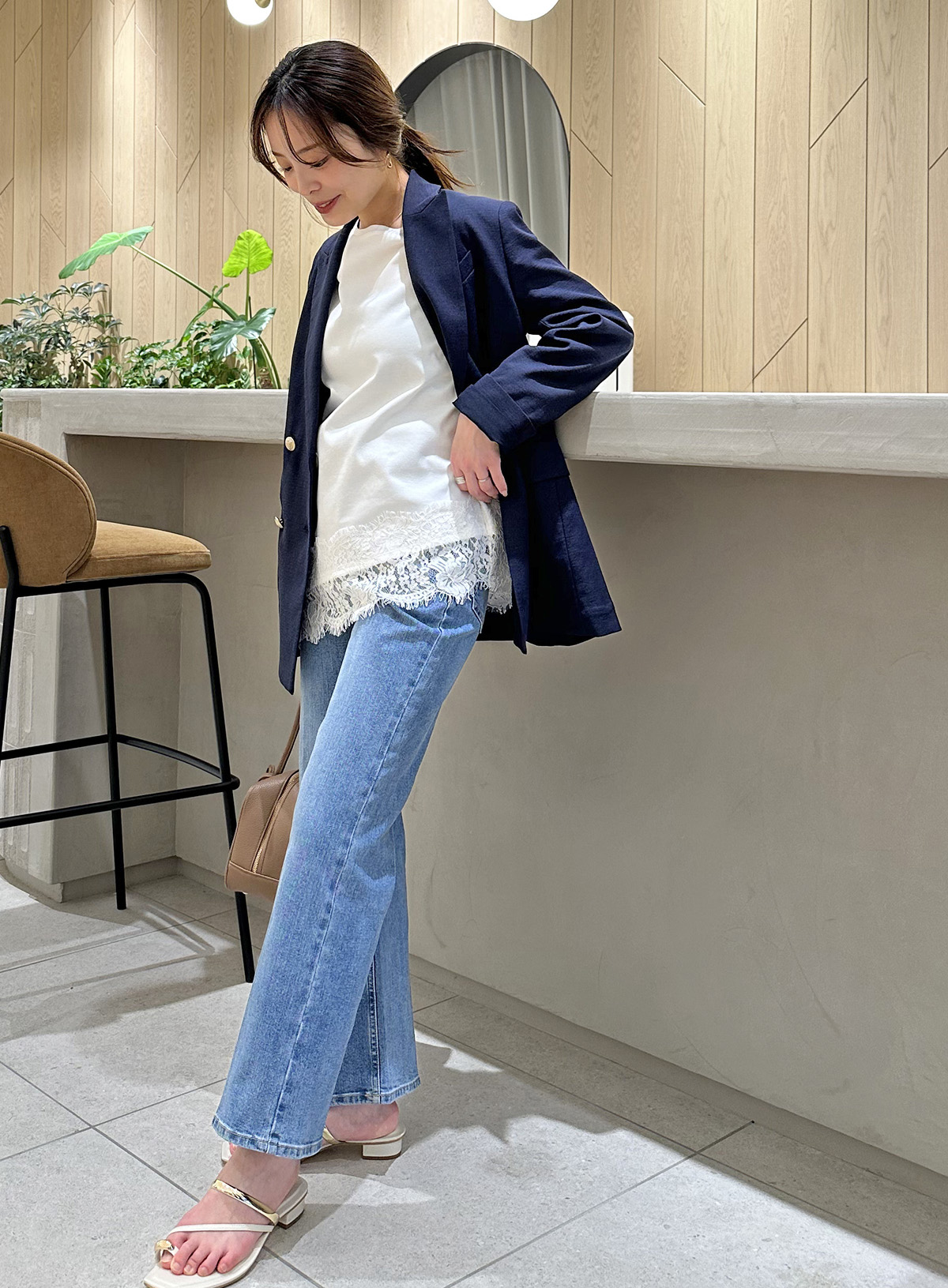 斜めカットの裾にレースをあしらったカットソー。カジュアルになりやすいカットソー素材には、ジャケットをONしてきちんと感をプラスして。