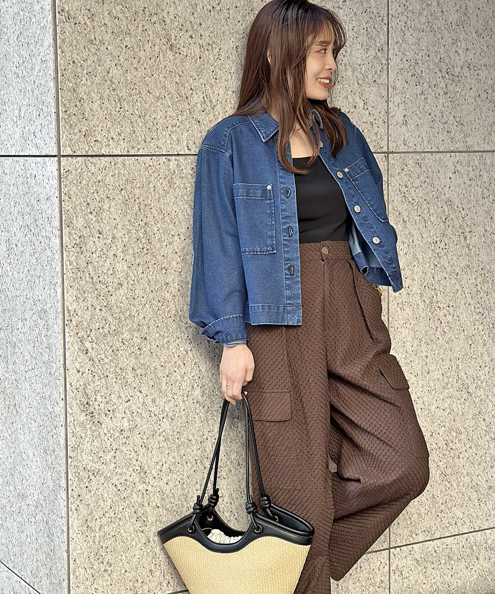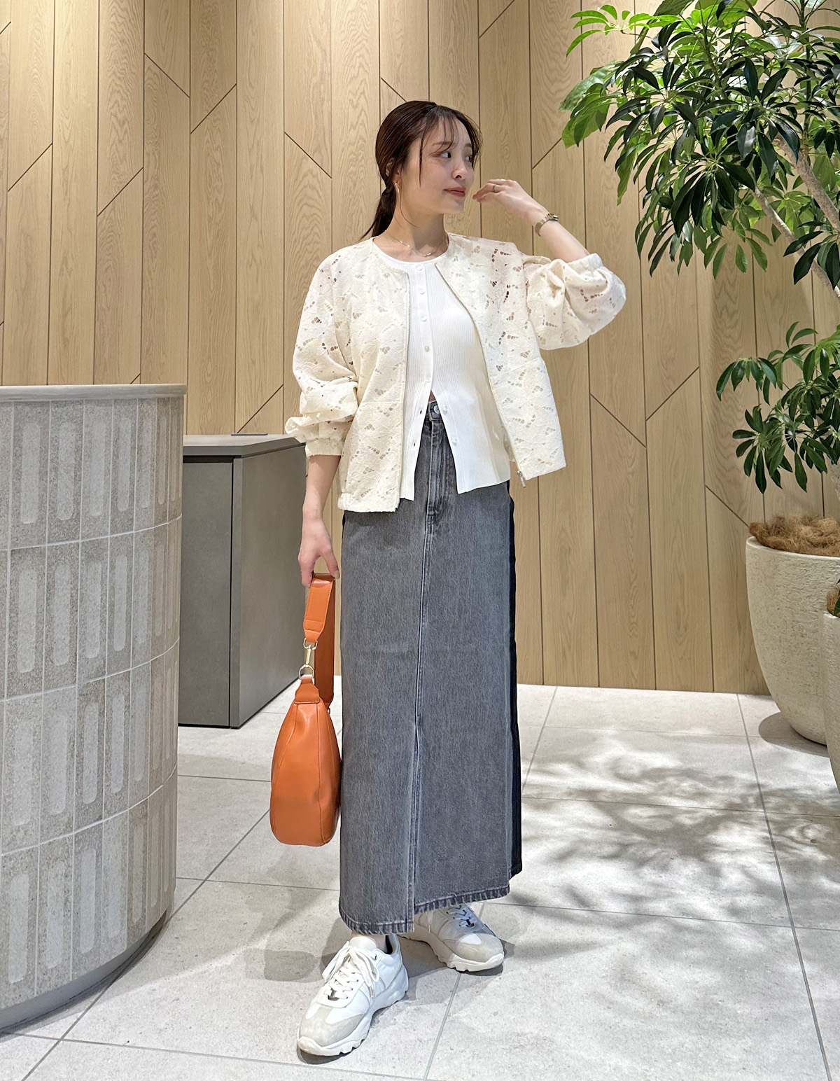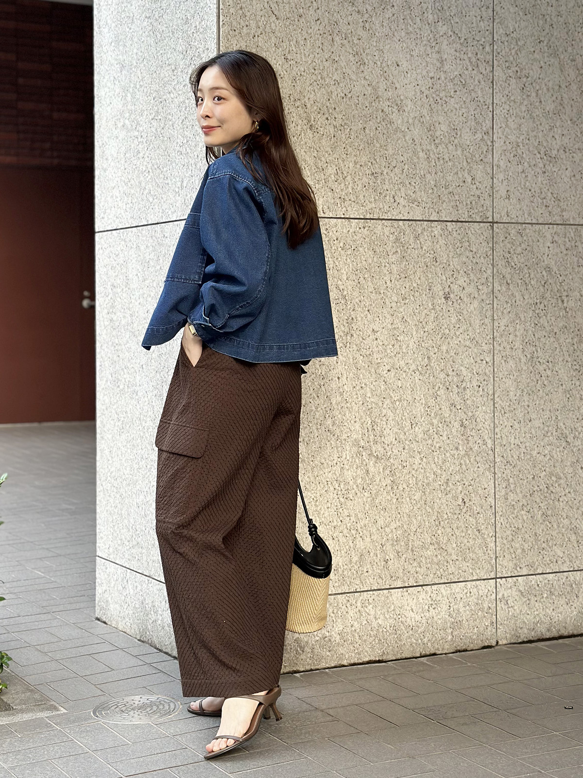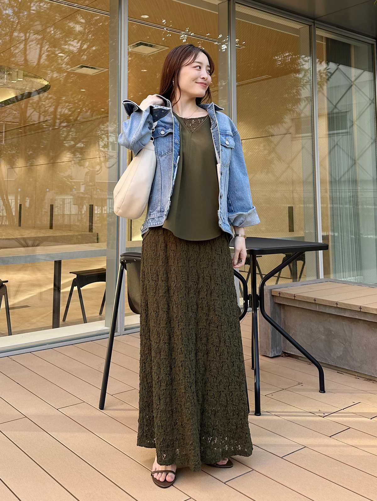 刺繍レース風のカーゴパンツは、甘さが苦手な方でも取り入れやすいアイテム。ブラウンのカラーに濃色のデニムシャツを合わせ、落ち着いたトーンでまとめることで、シックなカジュアルスタイルに。