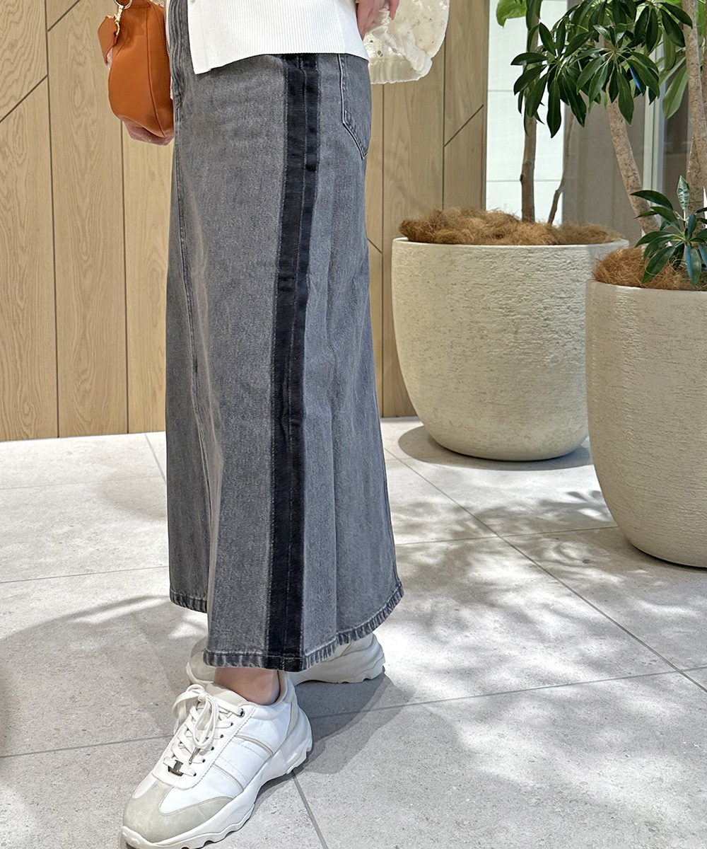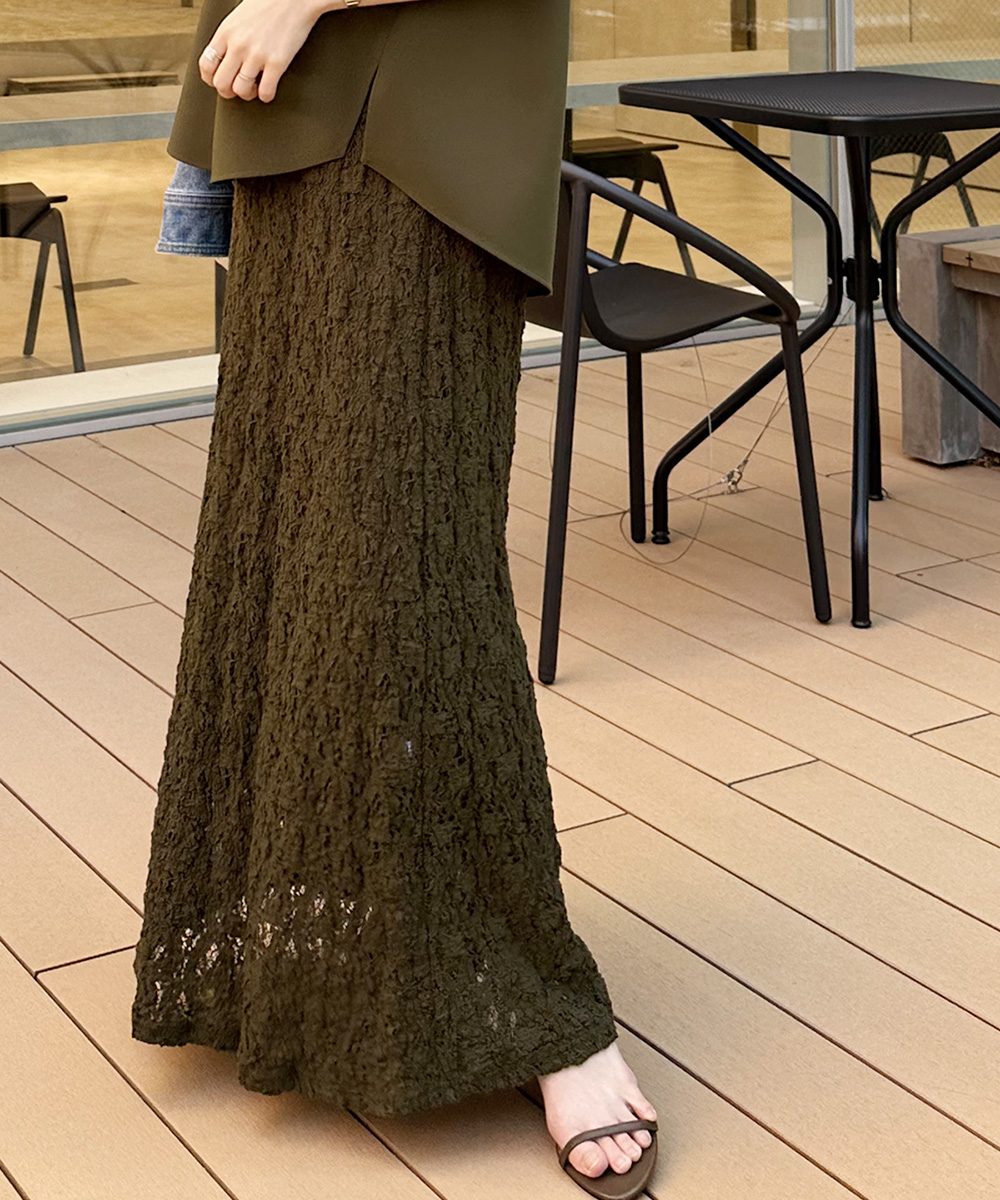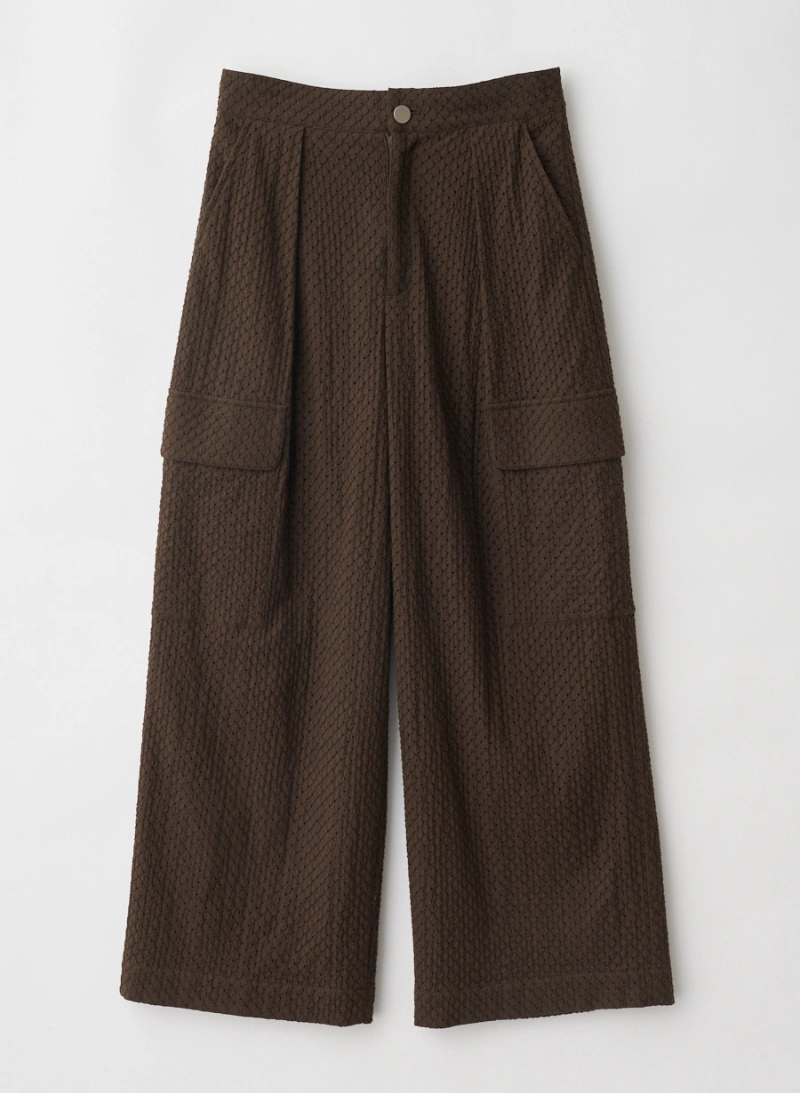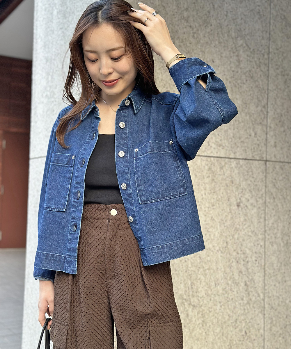 刺繍レース風のカーゴパンツは、甘さが苦手な方でも取り入れやすいアイテム。ブラウンのカラーに濃色のデニムシャツを合わせ、落ち着いたトーンでまとめることで、シックなカジュアルスタイルに。