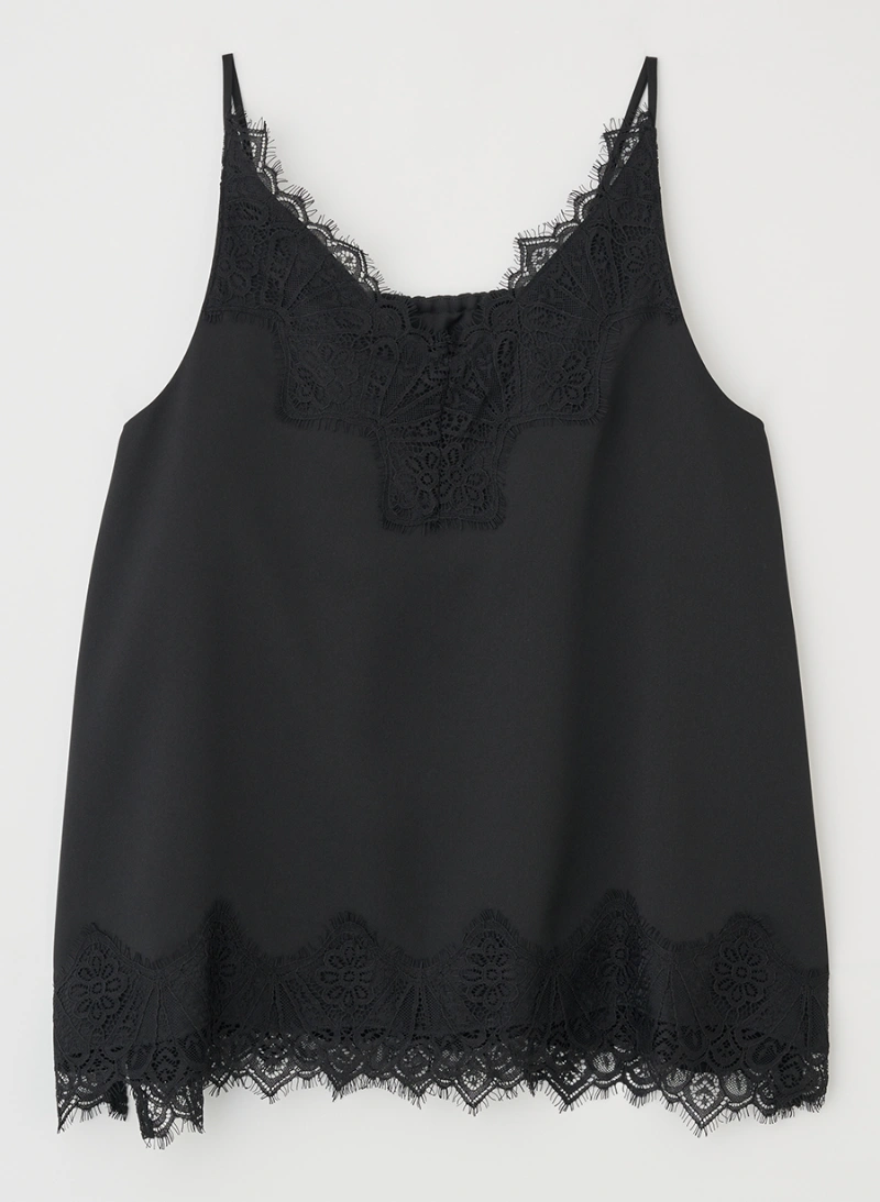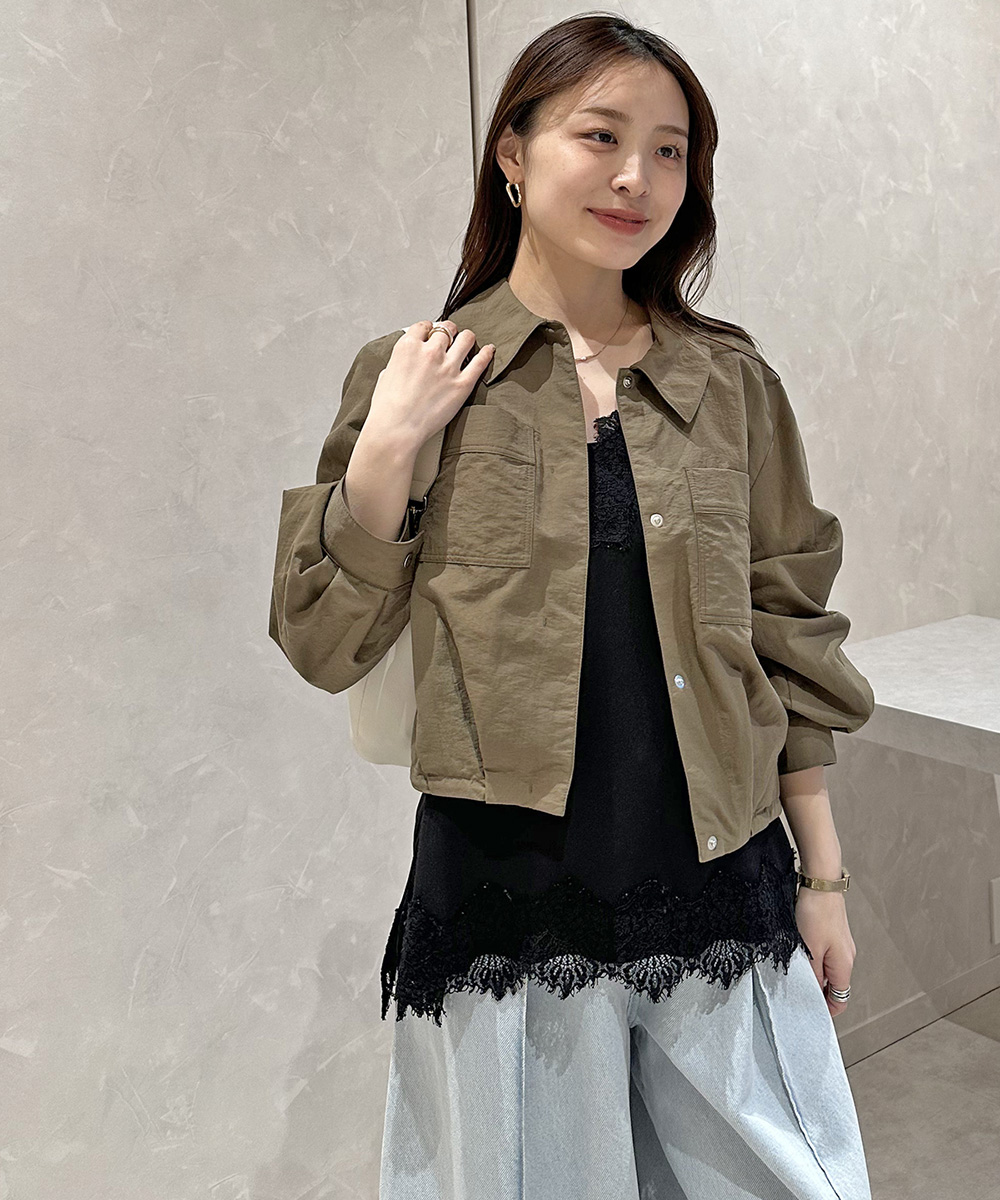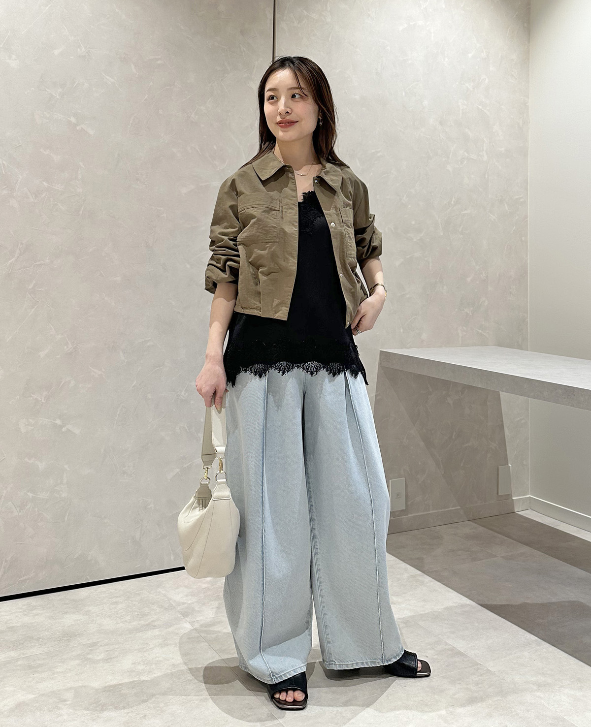 今季大トレンドのレーストリムキャミソール。カーキのブルゾンやバレルデニムパンツなどのメンズライクになりやすいアイテムに仕込み、さりげないフェミニンさを引き出して。