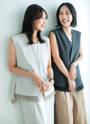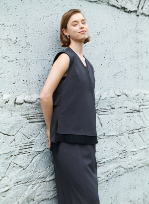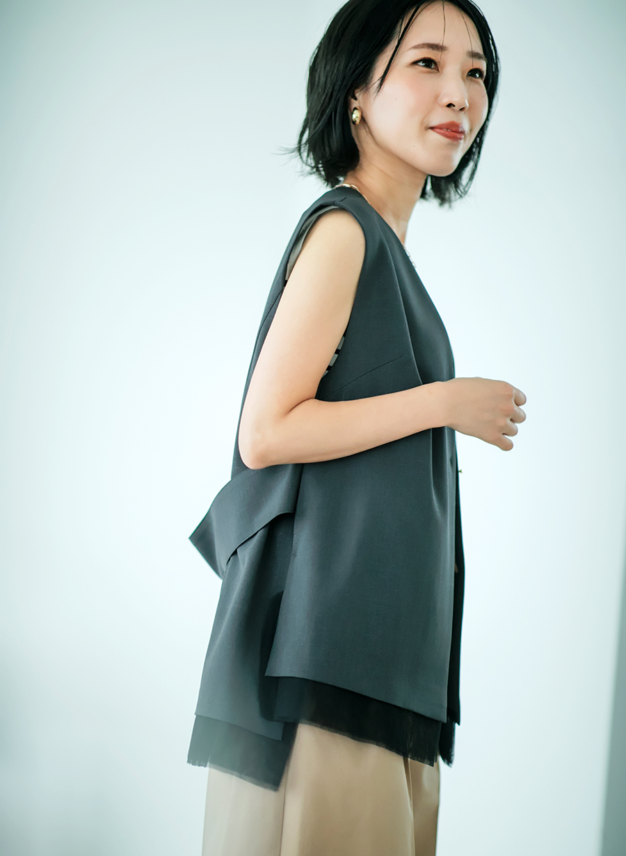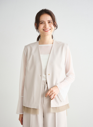 ・すっきりとしたシンプルなジレをベースに、裾にはやや配色の透け感のあるチュールを施しています。